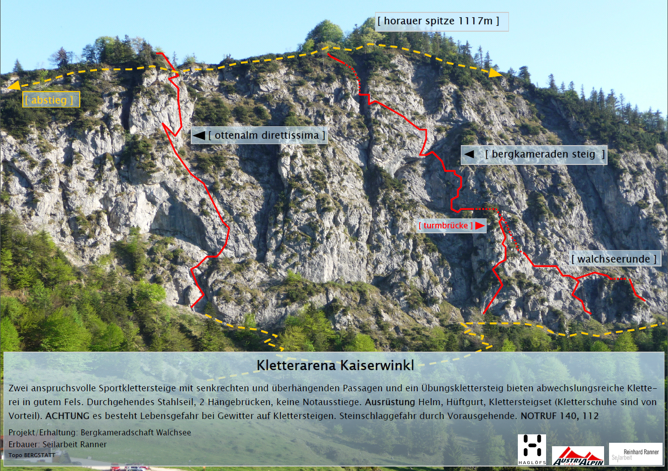 Die Klettersteige auf der Ottenalm in Walchsee betten sich perfekt in diese Landschaft der vegetationsreichen Felswände der Harau Spitze ein. Drei Klettersteige reichen durch diese Wand. Die Ottenalm Direttissima ist klettertechnisch für Begeher sehr anspruchsvoll und durchgehend anstrengend. Die Walchsee Runde ganz rechts ist ideal für Anfänger geeignet. Von hier beginnt auch die Variante des Bergkameraden Steig, welche den Einstiegsturm und die Brücke auslässt. Der Bergkameraden Steig bietet ansprechende Stellen und wartet mit einigen Überraschungen auf. Die Zweiseil- „Brücke am Gweih“ verlangt etwas Mut bietet aber einen Tiefblick ins Tal bis hinunter zur entfernten Schwemm, dem größten Hochmoor Tirols. Zum Schluss nach schönen Wandpassagen geht’s noch über die „Schluchtenscheißer“ Brücke direkt zum Ausstieg an er Harau Spitze. Der Abstieg folgt durch die wohlriechenden Latschengassen bis zum Harau Sattel.