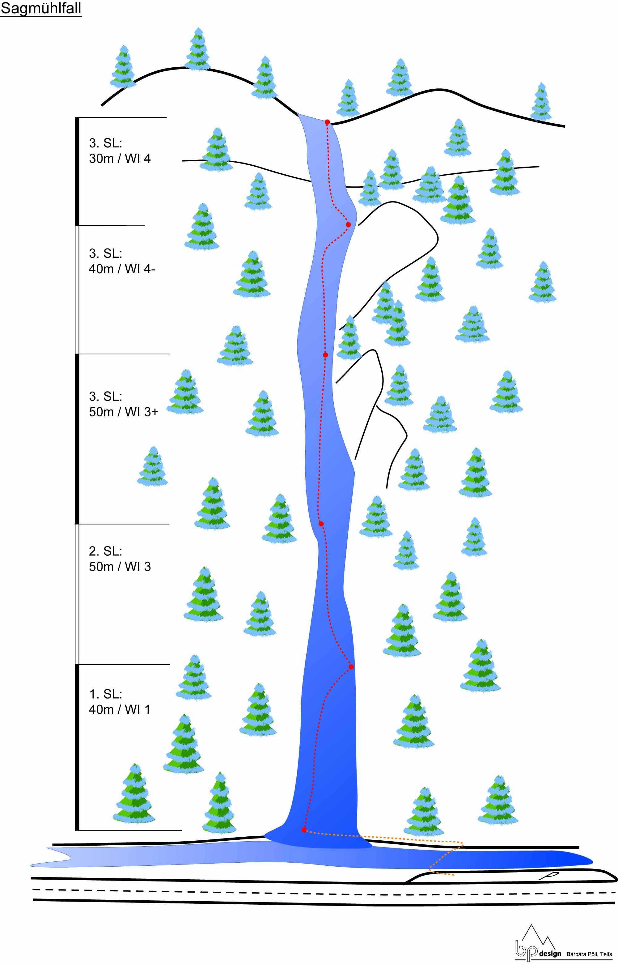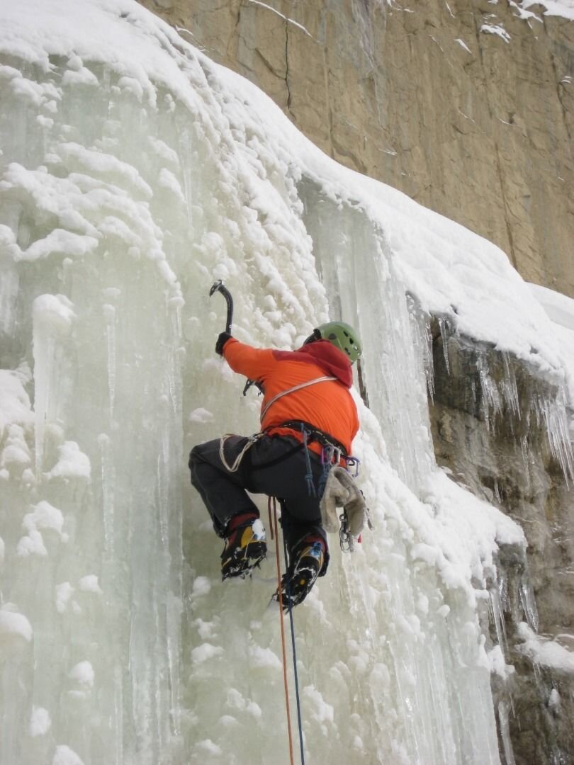 Absteig: Abseilen an Eisuhren, oder auf der orographisch rechten Seite des Wasserfalles absteigen.