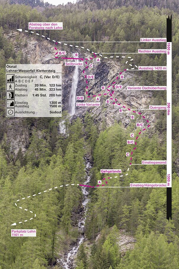 2014 wurde der Lehner Wasserfall Klettersteig mit der linken Variante erweitert. Die nach links verlaufender neuer Variante ist für Könner ein Klettersteig-Highlight wie es ein zweites Mal nicht so schnell gibt. Nach einer leichten Querung ist der erste Überhang im höchsten Schwierigkeitsgrad (E) zu klettern. Für Kinder ist diese Variante nicht geeignet. Die Originalroute, die rechts vom Was­serfall verläuft, ist zwar deutlich leichter als die neue Variante verlangt aber dennoch Kraft, Trittsi­cherheit und alpine Erfahrung. Beim Originalausstieg kann man seine Kräfte beim kurzen, aber schwierigen Überhang auf die Probe stellen. Der Überhang kann Links durch eine leichte Variante umgangen werden. 50 Meter oberhalb vom Ausstieg führt ein Wanderweg bis zur neuen Seilbrü­cke, somit kann jeder das neue Highlight genießen.