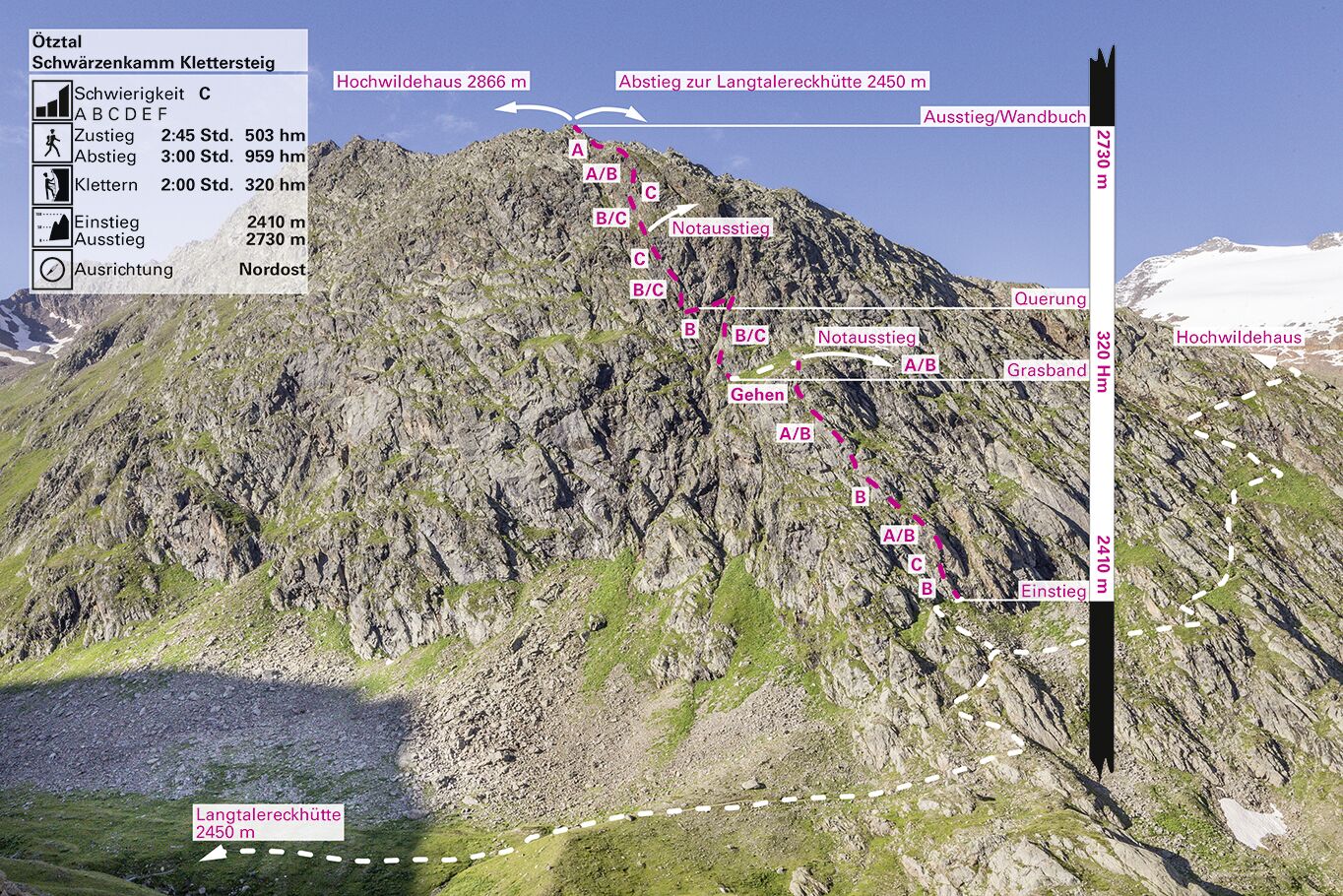 350 Höhenmeter (2.410 – 2.760 m) und 700 m Kletterlänge. Ca. 3 Stunden, mit dem Abstieg zur Langtalereck Hütte 4 Stunden.