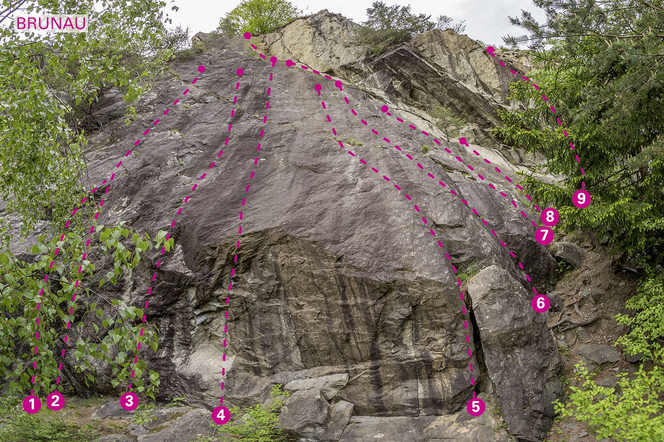 Auf dem Rad- und Fußweg neben der B186 bis auf Höhe des Forstweges gehen. Die B186 überqueren und dem Forstweg ca. 200m bis zum Ende bei einer Wiese folgen. Hier rechts über Felsblöcke zum Wandfuß aufsteigen.