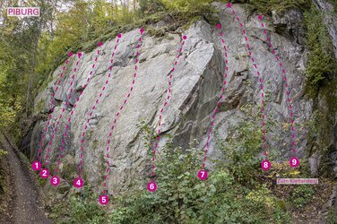 Der Klettergarten Piburg liegt in der Nähe des Parkplatzes Piburg und ist in wenigen Minuten zu Fuß erreichbar. 9 Routen auf bis zu 15 Metern bieten insbesondere Anfängern und Genusskletterern eine gute Auswahl an leichten Touren.