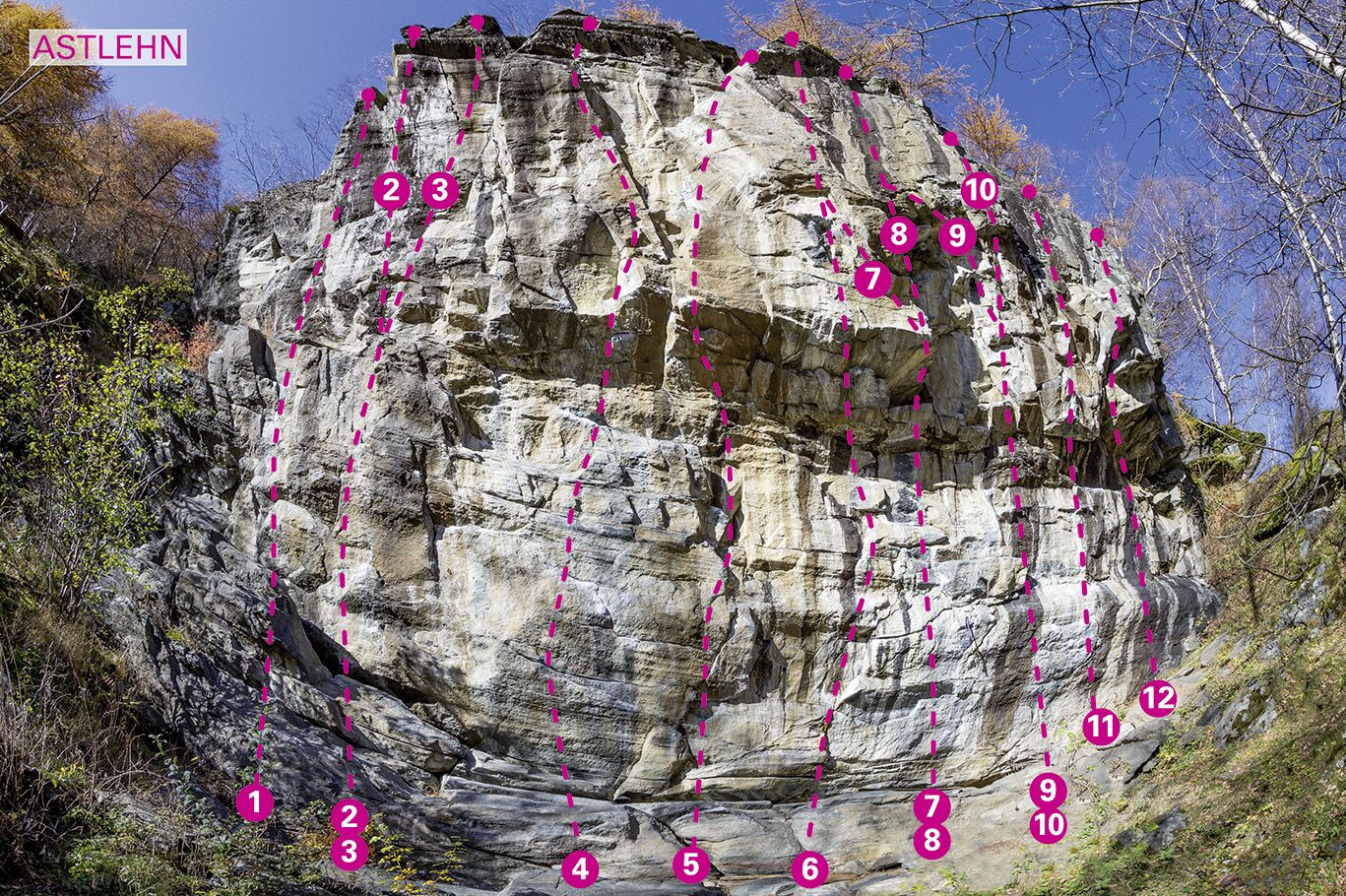 Der Klettergarten Astlehn gehört zu den traditionellsten und zugleich beeindruckendsten Gebieten Tirols. In den frühen 80er Jahren wurden an diesem sehr überhängenden Felsblock Klettergeschichte geschrieben. Wer den anspruchsvollen und kraftbetonten Linien gewachsen ist, kann sich in Astlehn den einen oder anderen Meilenstein der Klettergeschichte holen.