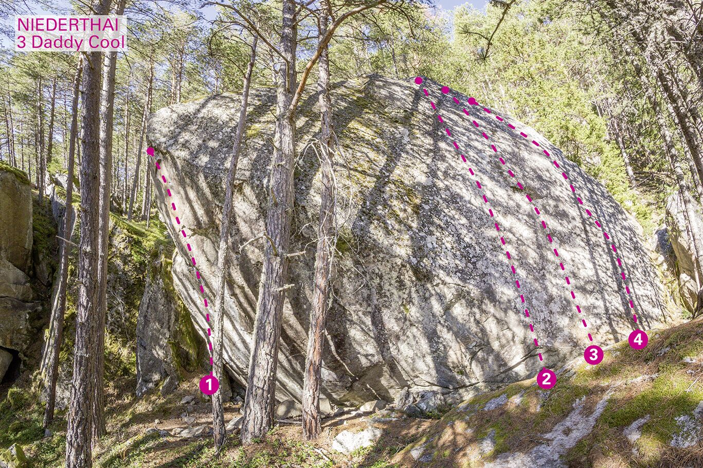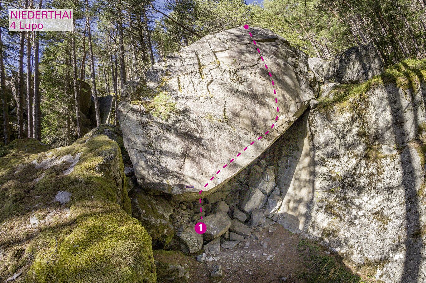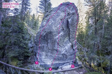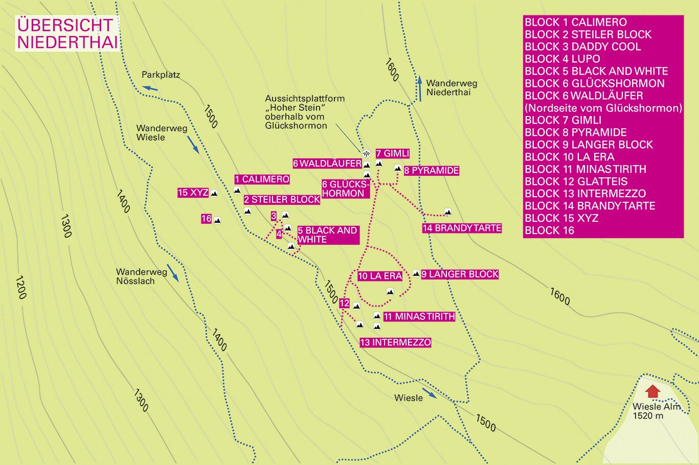 Vom Parkplatz folgt man dem Wanderweg zum Gasthaus "Wiesle" für etwa 20 Minuten. Die ersten Blöcke befinden sich direkt am Wegrand. Für die weiteren Blöcke bleibt man noch für ca. 3 Minuten auf dem Wanderweg und verlässt diesen dann links.