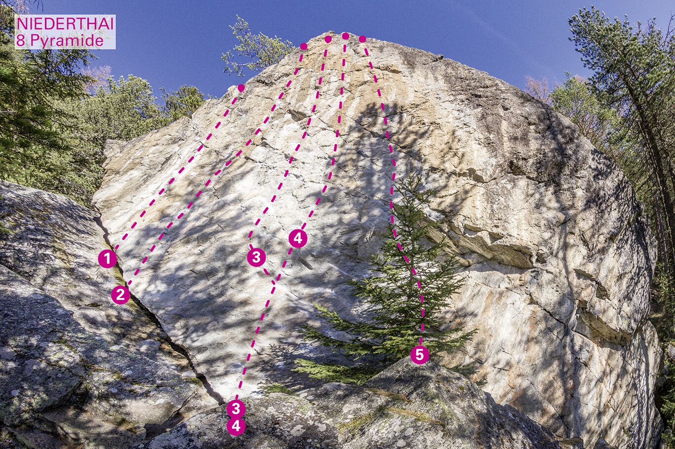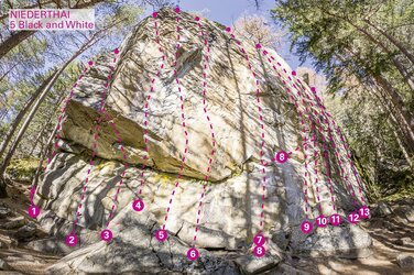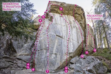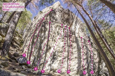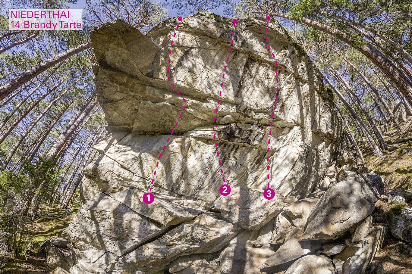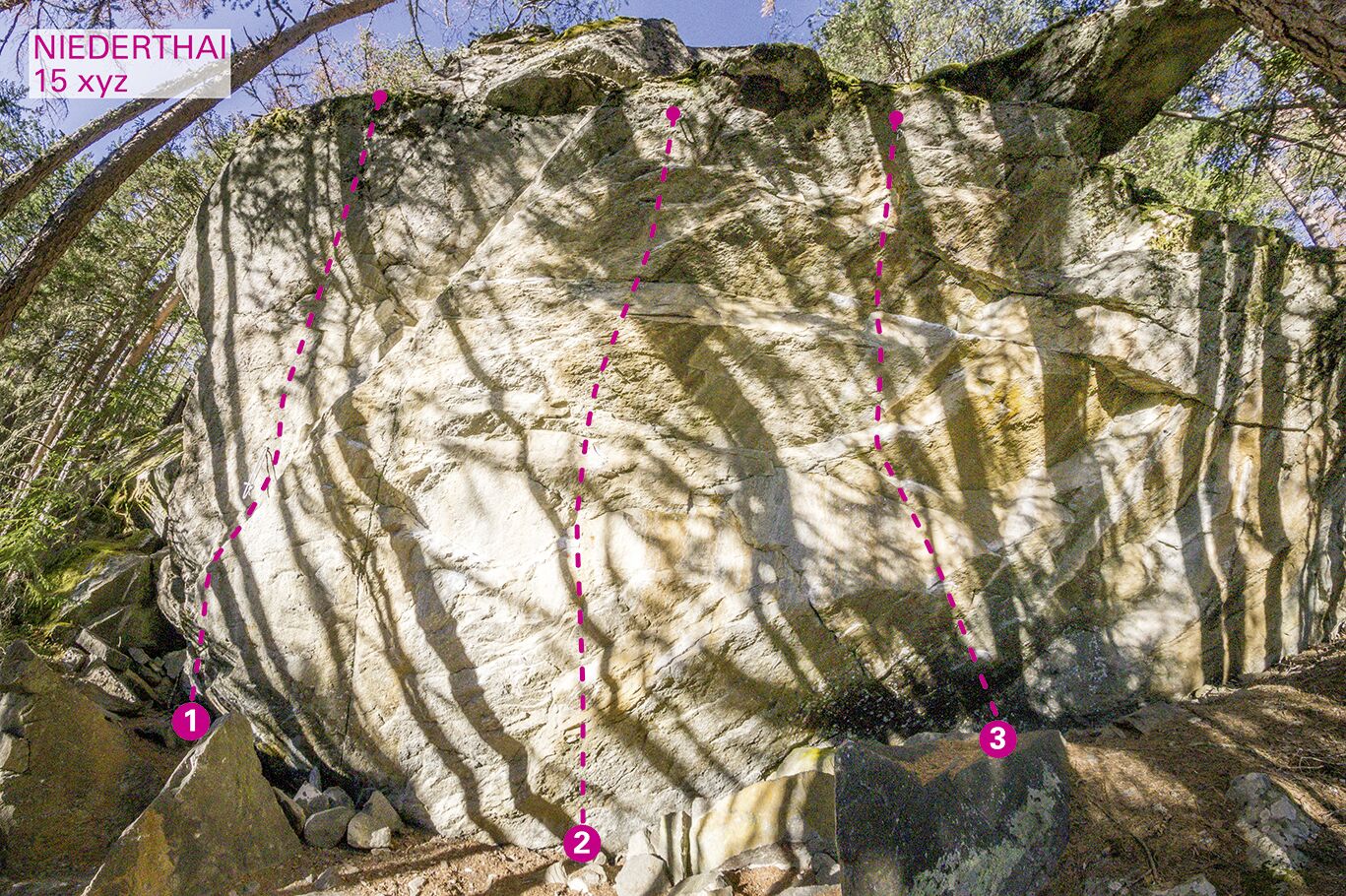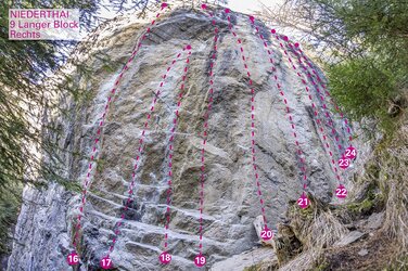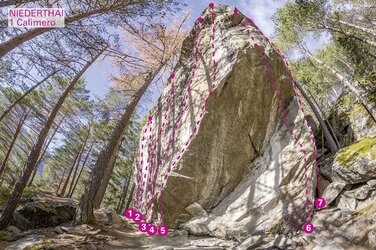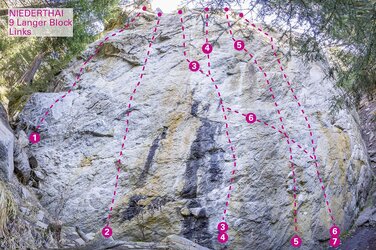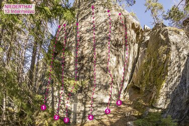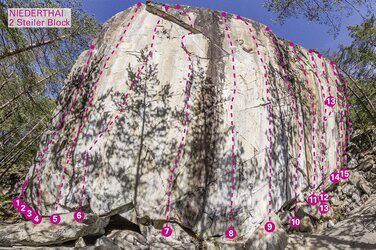 Die Klettererie an den Blöcken gestaltet sich aüßerst abwechslungsreich: Risse, Verschneidungen, steile Platten, und Überhänge stehen  auf der "Kletterspeisekarte". Anfänger werden hier allerdings kaum fündig. Die Kletterei bewegt sich vorwiegend in den mittleren bis oberen Graden,  noch dazu sind die  Routen eher streng bewertet.