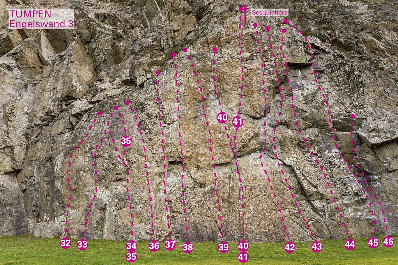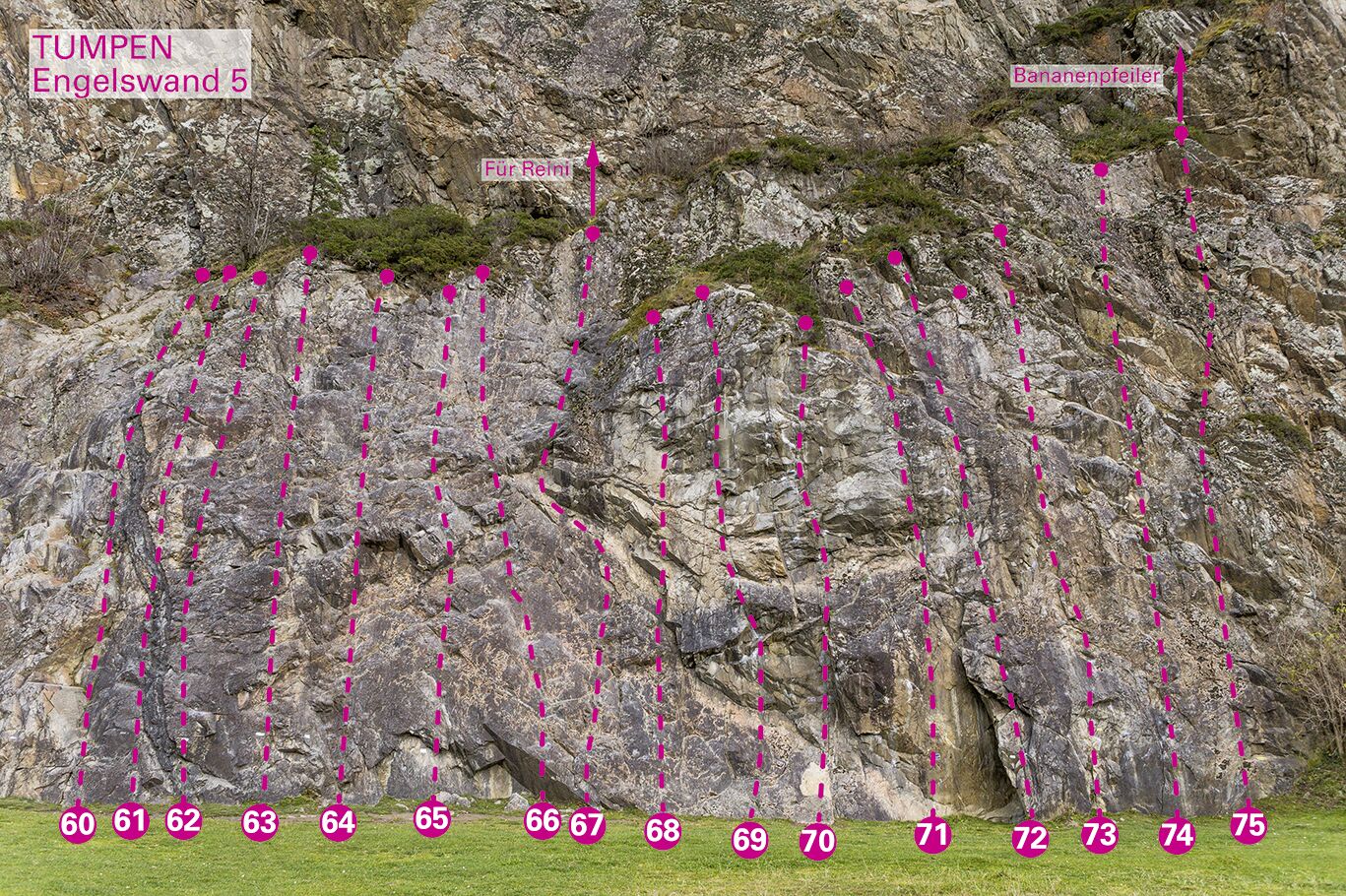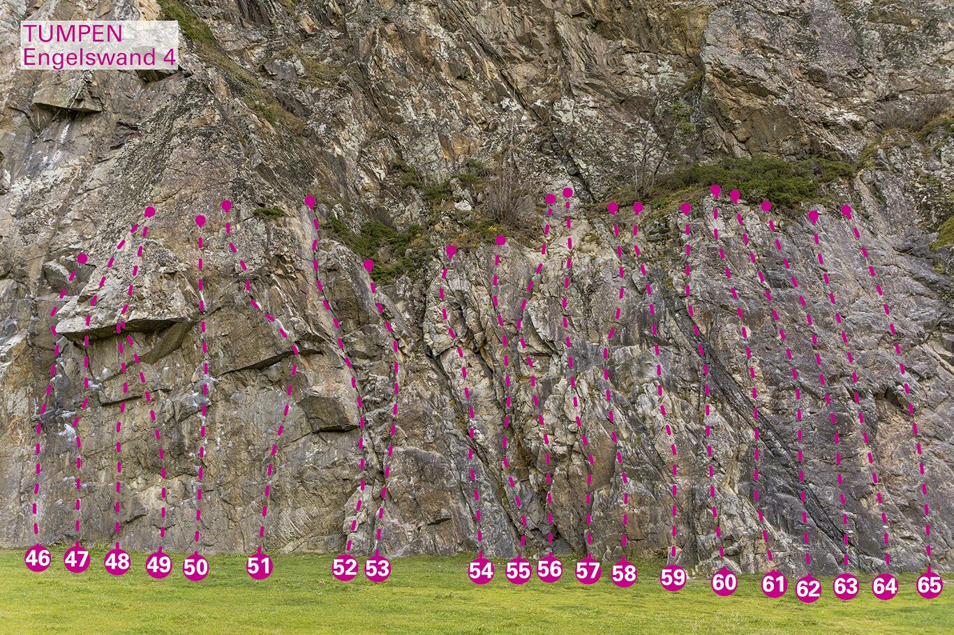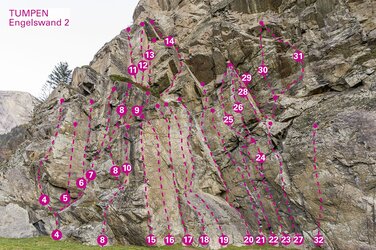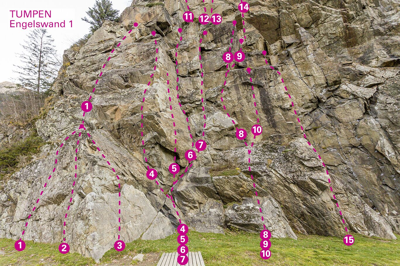 Die Engelswand in Tumpen ist wohl der Inbegriff eines ideal gelegenen Klettergartens. Von weitem bereits ist die Wand mit ihrem rötlichen Gneis sichtbar. Eben spaziert man vom eigens angelegten Parkplatz durch idyllische Felder zum Wandfuß ...