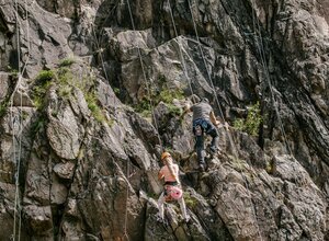 Eine große Wiese am Wandfuß sowie ein vielfältiges Routenangebot machen den Klettergarten Tumpen zu einem der attraktivsten Klettergebiete Tirols.
