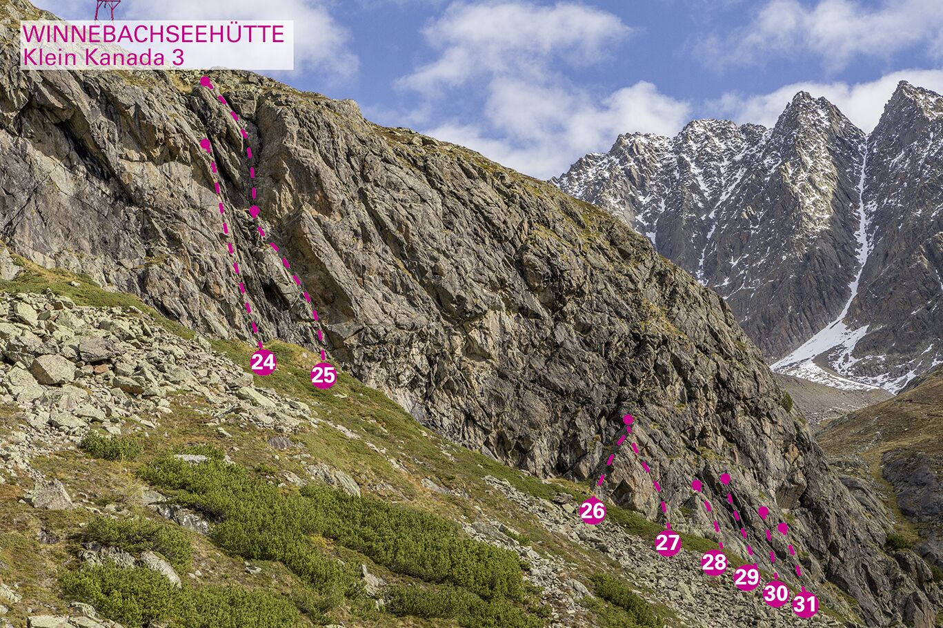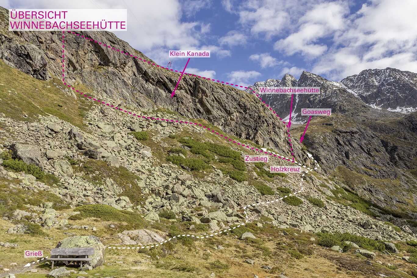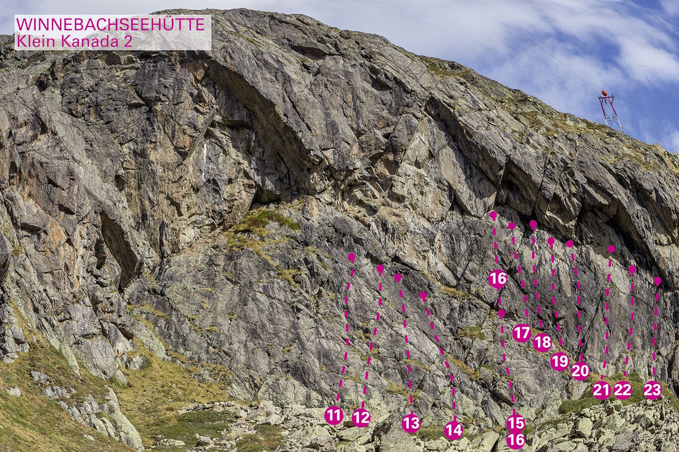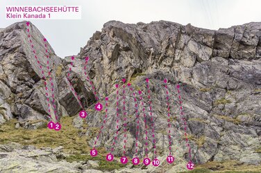 Markanter Felsriegel südwestlich der Winnebachseehütte (10 Min. entfernt). Bombenfester, gutgriffiger Gneist in traumhafter Umgebung. Für Anfänger gut geeignet.
