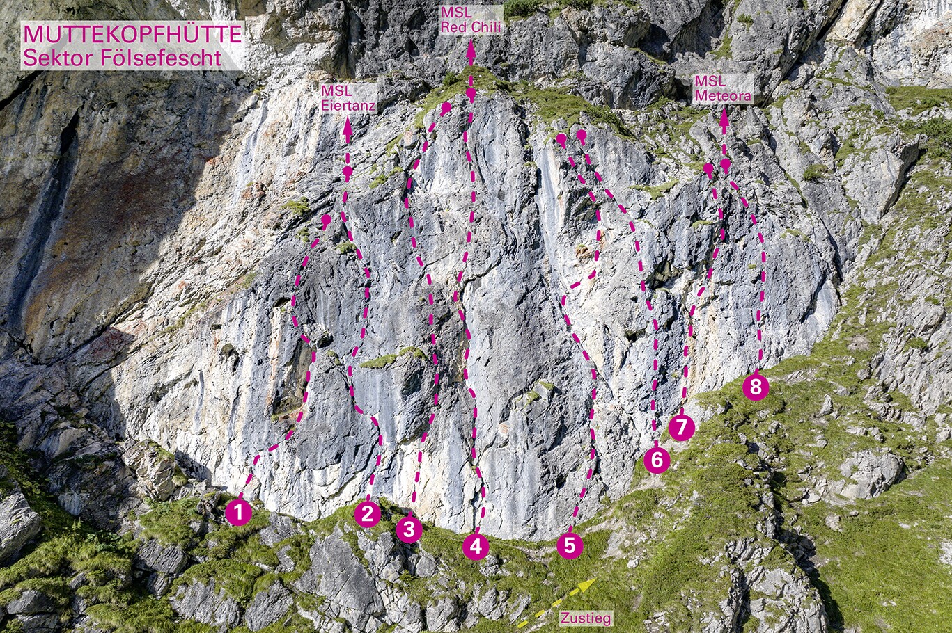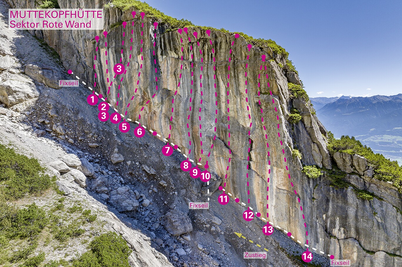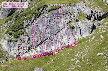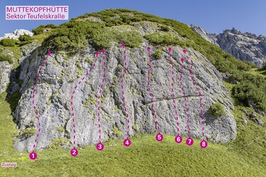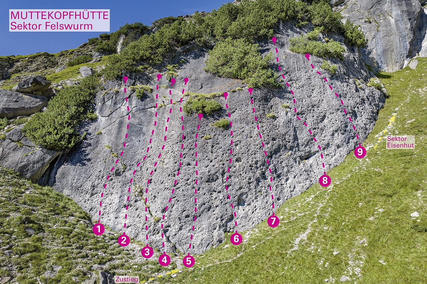 Die einzelnen Sportkletterrouten sind von der Muttekopfhütte in 5-30 Minuten erreichbar.