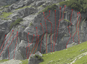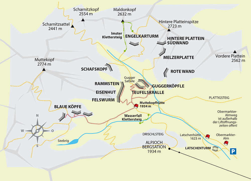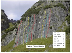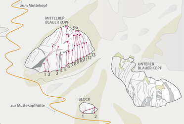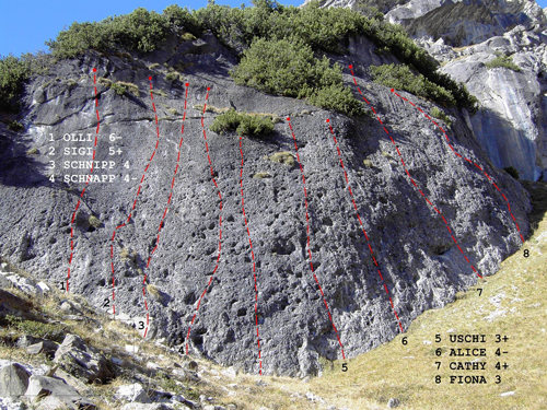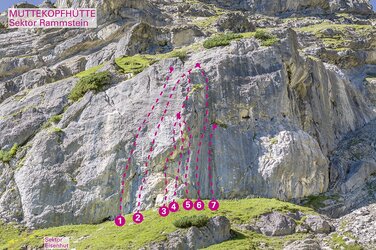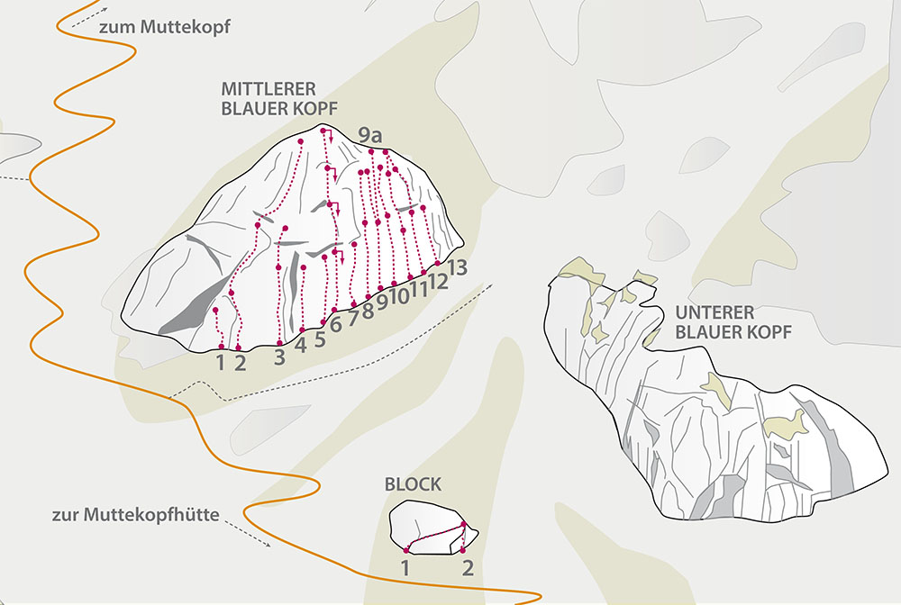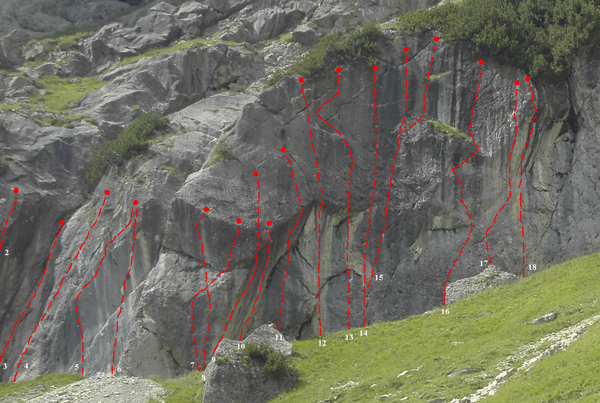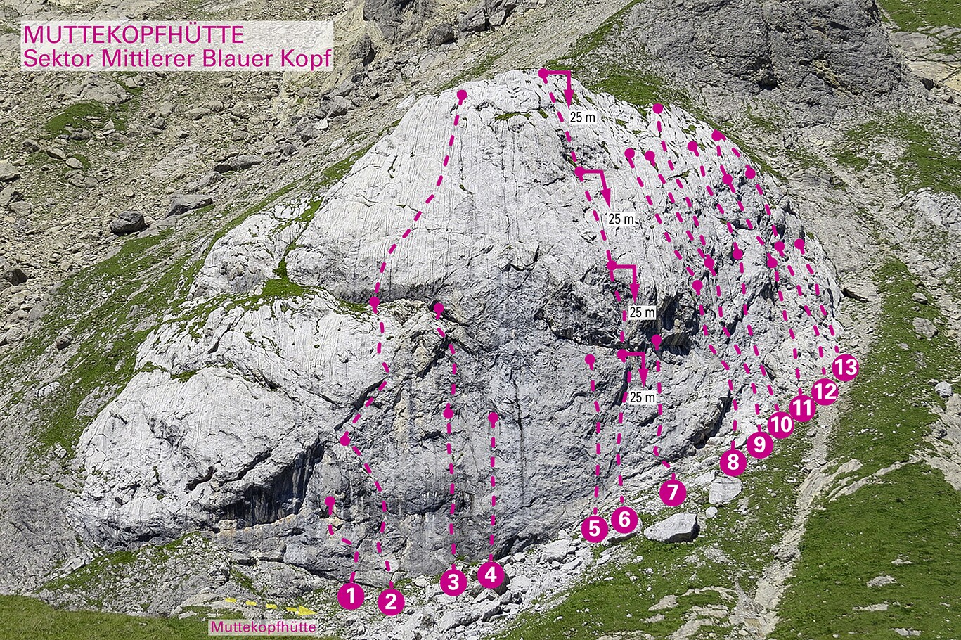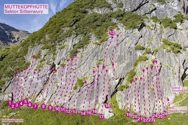 Die einzelnen Sportkletterrouten sind von der Muttekopfhütte in 5-30 Minuten erreichbar.