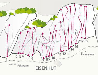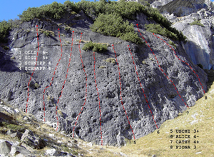Die Routen "Eiertanz" und "Red Chili" sind jeweils die ersten Seillängen einer Mehrseillänge.