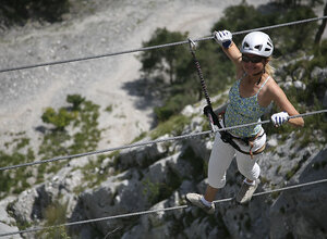 Schwierigkeit/Ausrüstung: Der Klettersteig ist ohne Tritthilfen ausgestattet und bestens gesichert. Auf den steilen Felsplatten kann man sehr gut auf Reibung klettern.