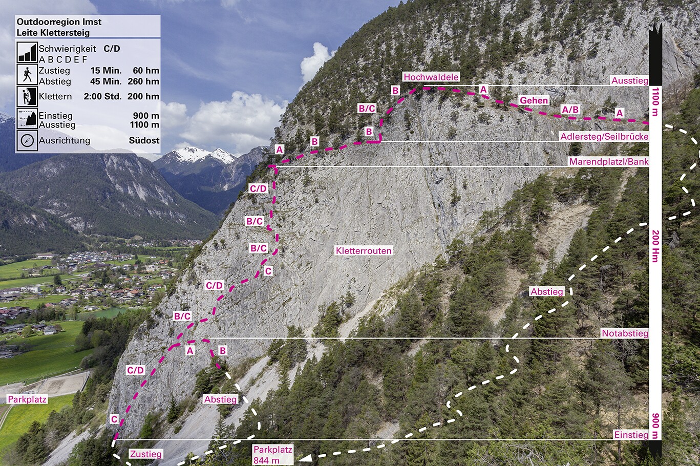 Schwierigkeit:Einstieg bis Marendplatzl C/D, Marendplatzl bis höchster Punkt B (+ Seilbrücke)
