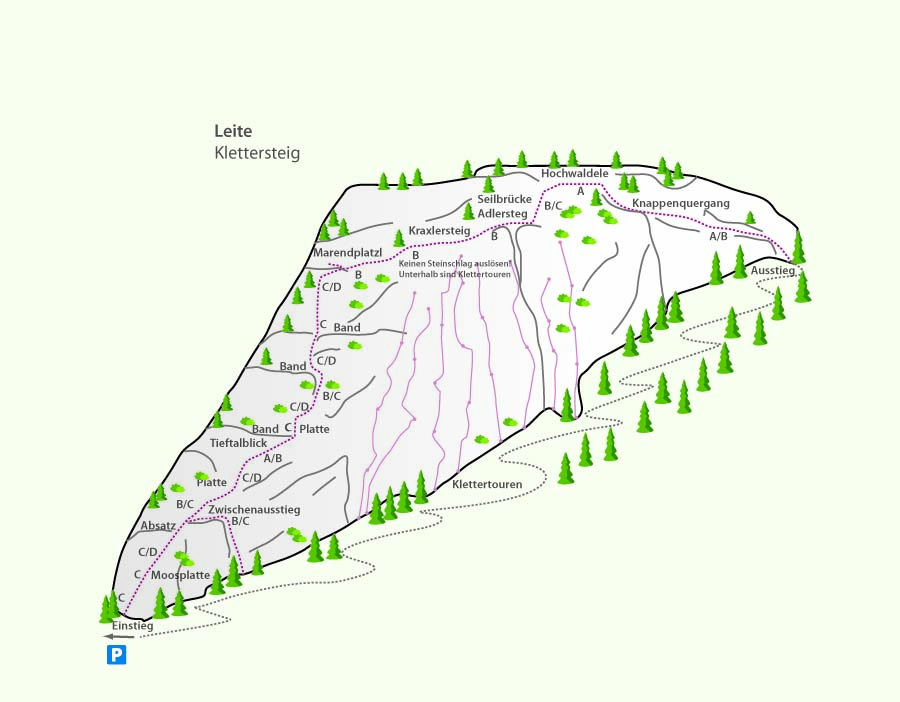 Vom Parkplatz (Informationstafel) in 15 Minuten zum Klettersteig.