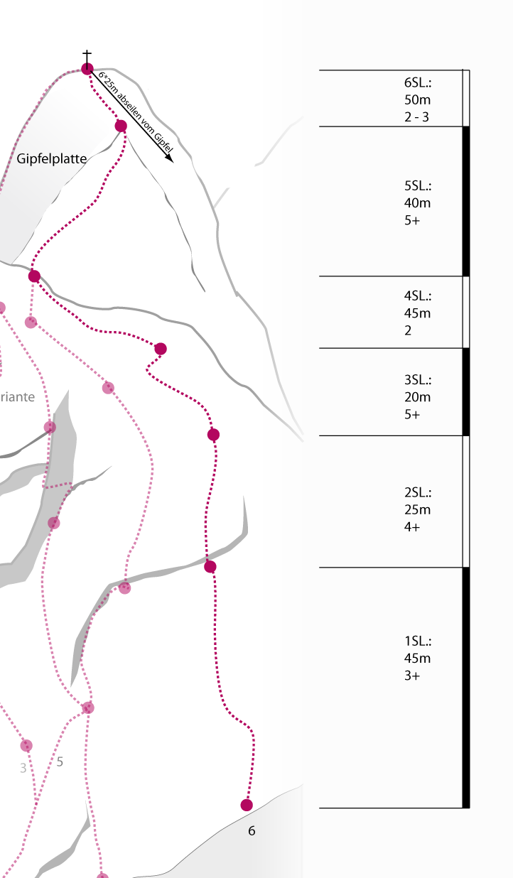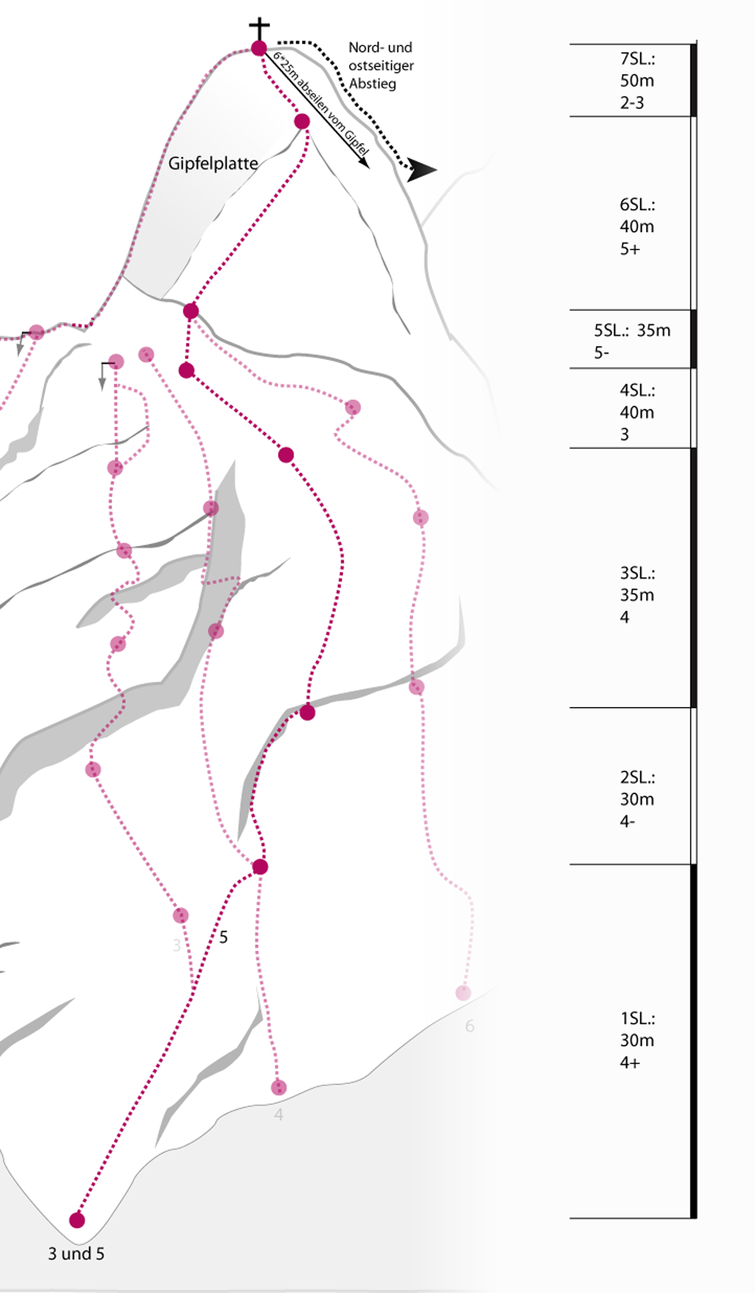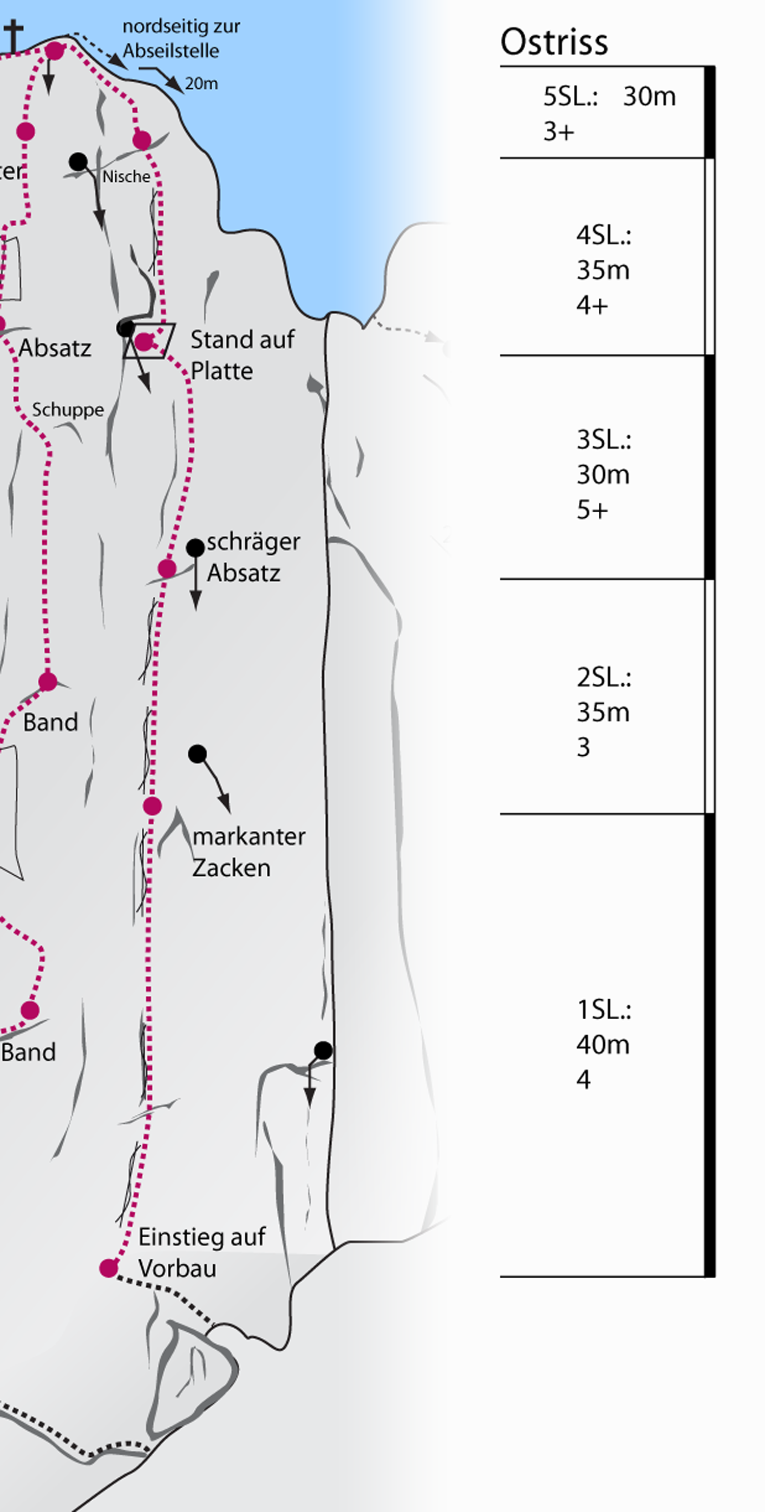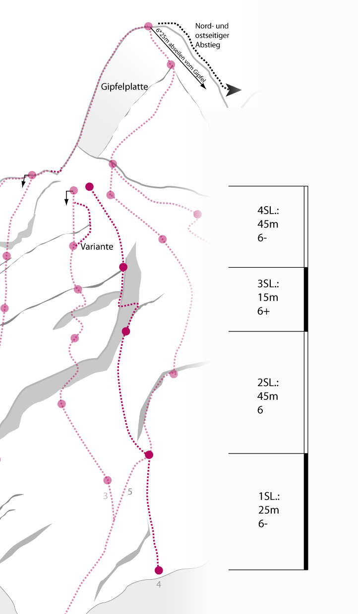 Es gibt 2 Abseilpisten:1. Direkt vom Gipfel über die Ostseite abseilen - Einfachseil 50m
