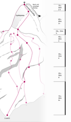 Schöne, lohnende Kletterrouten, vorwiegend an Platten, Rissen und überhängend.