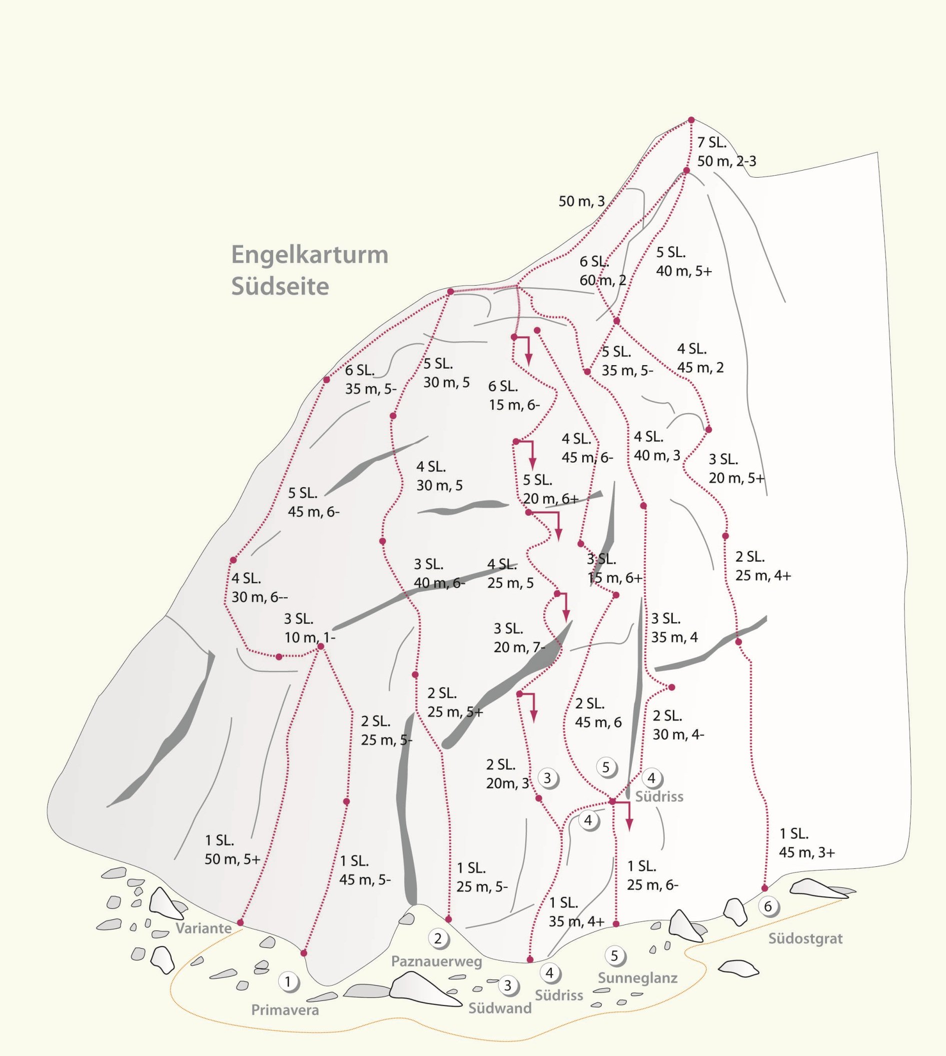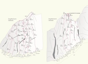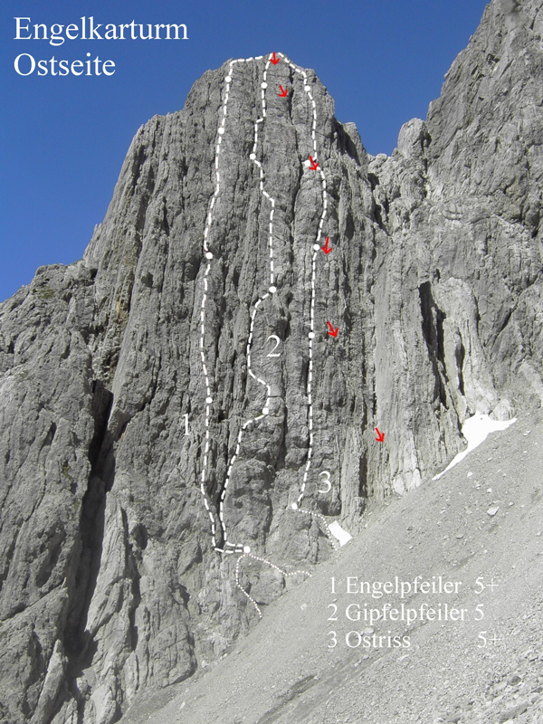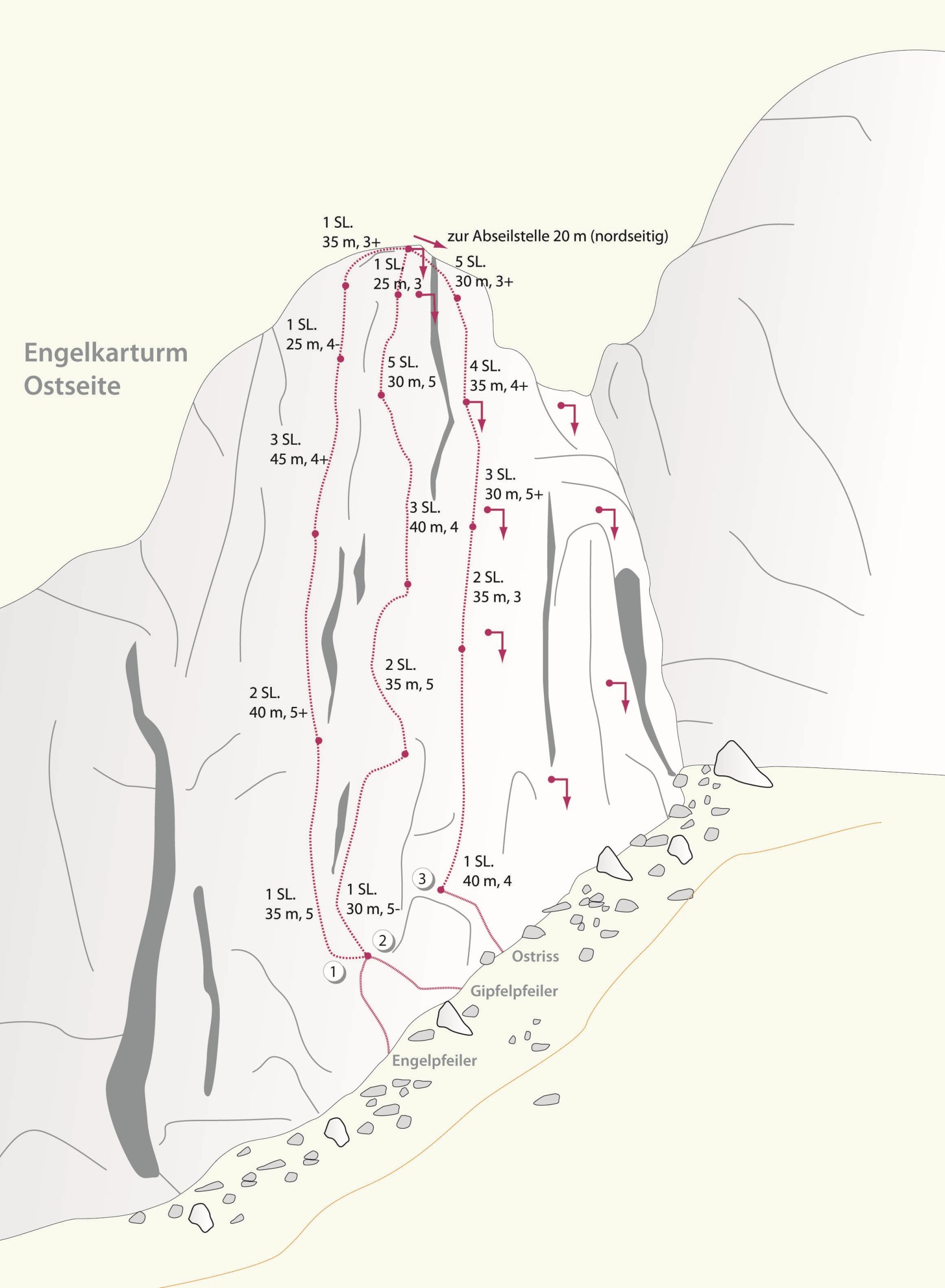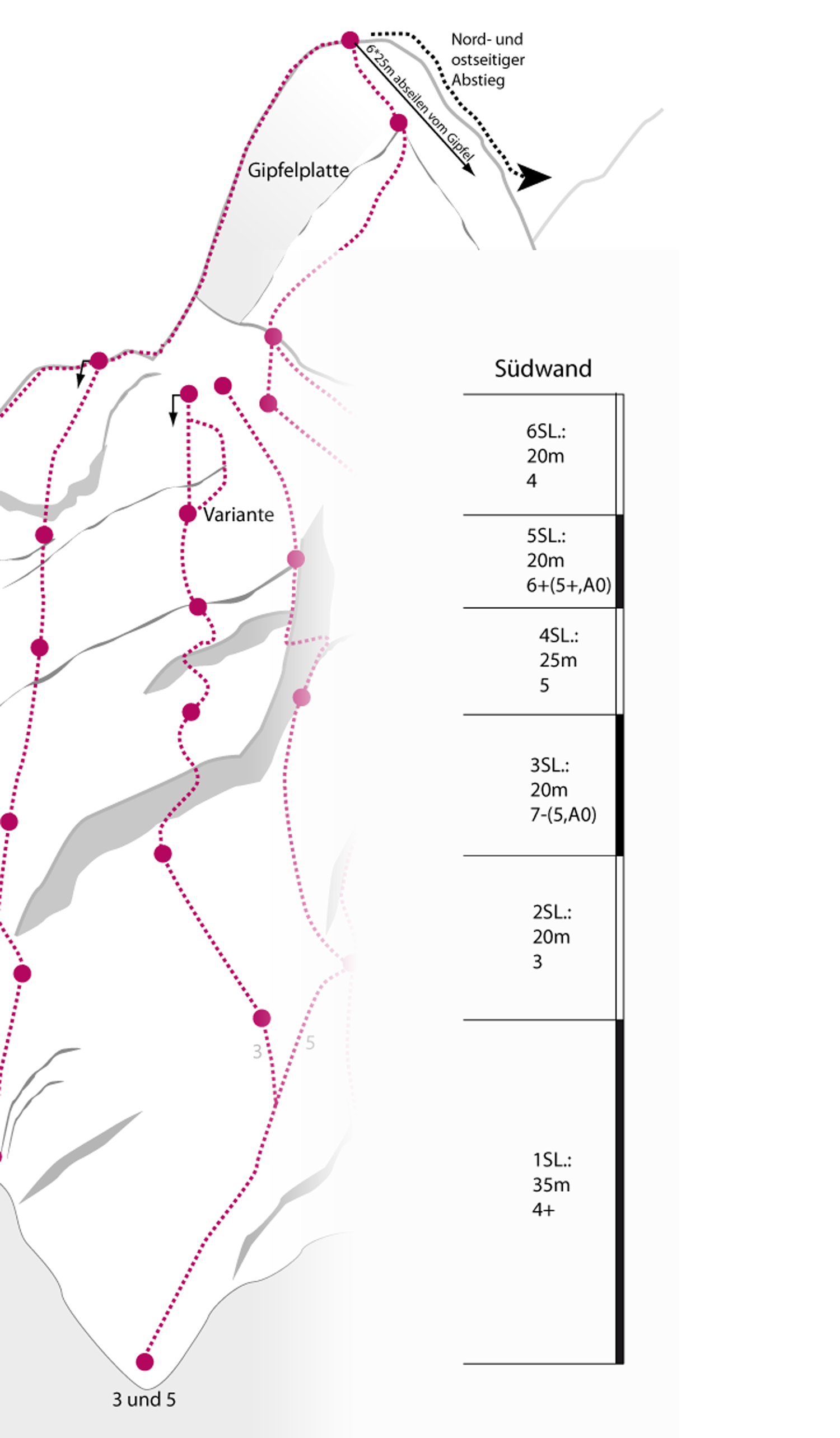 2. Der zuerst nord- dann ostseitige Abstieg ist an den Abseilstellen markiert. 50m Einfachseil genügen.