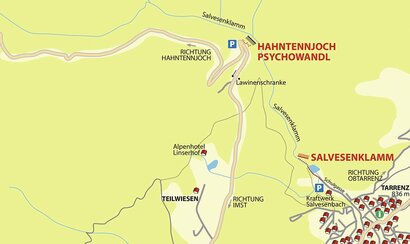 Von Imst der Bundesstraße in Richtung Hahntennjoch (Elmen, Lechtal) folgen. Nach dem Ortsende von Imst am Alpenhotel Linserhof und an den Lawinenschranken vorbei. Etwa 200 Meter nach den Lawinenschranken erreicht man eine Linkskehre.