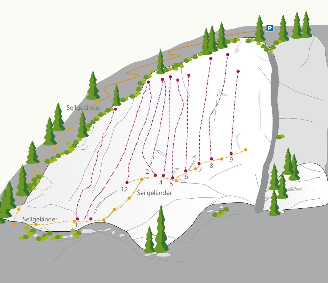 Fast alle Routen sind in den oberen Schwierigkeitsgraden. Über ein Seilgeländer, welches direkt zum Felsen hinunterführt gelangt man zum extrem ausgesetzten Einstiegsbereich. Zu den Einstiegen führt dann ein Fixseill.