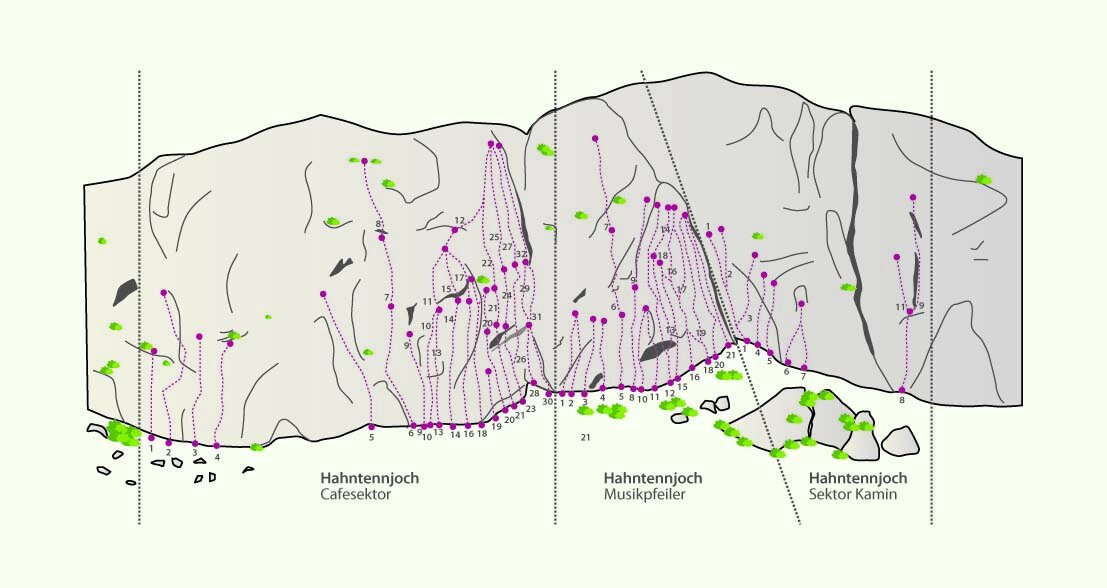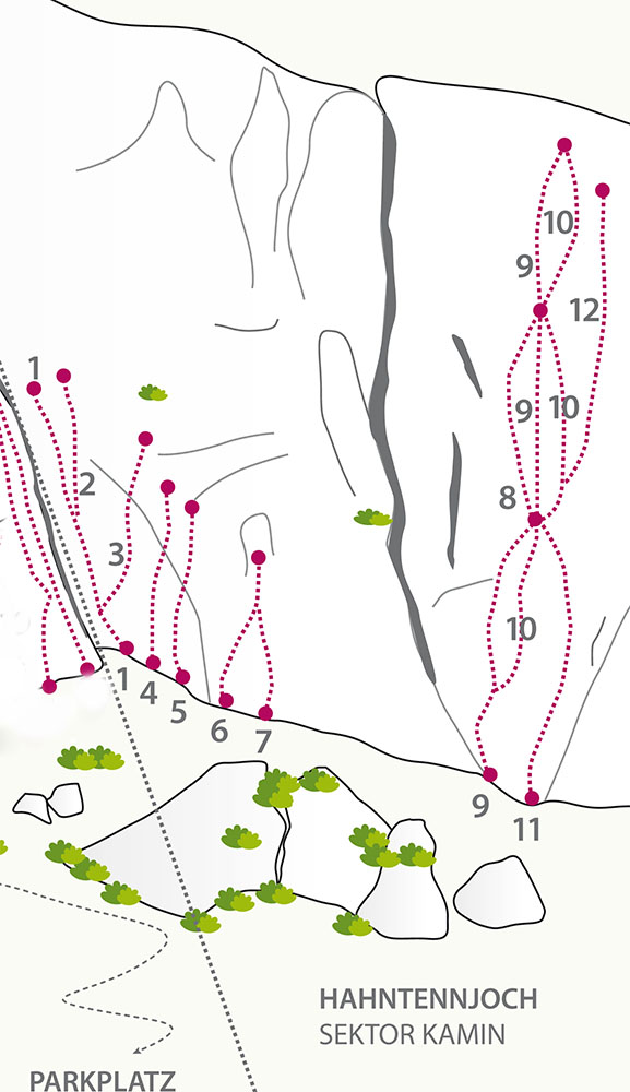 Der Klettergarten Hahntennjoch liegt in schöner, sonniger Lage inmitten der Lechtaler Alpen an den Südhängen des Falschen Kogels. Die Routen sind in überwigend gutem Gestein angelegt und dennoch recht schnell zu erreichen (ca. 30 Minuten).