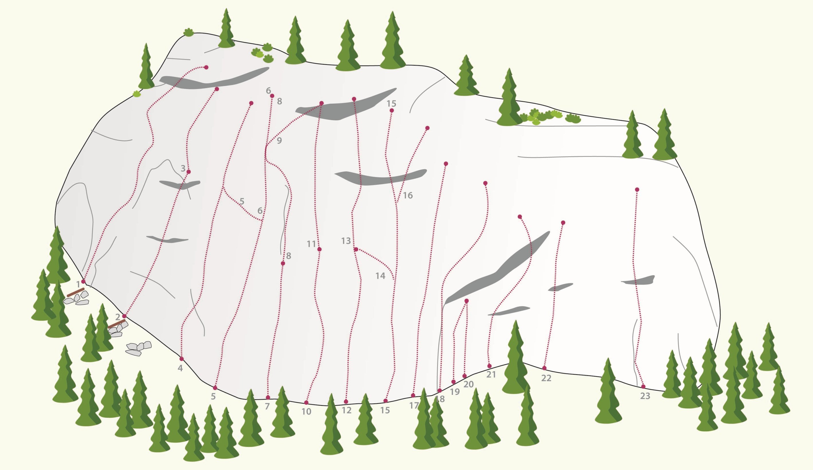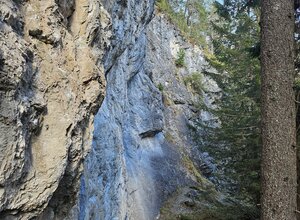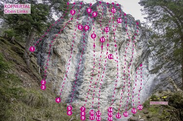 Im Oberen Sektor dominieren an der bis zu 35 Meter hohen Wand anspruchsvolle, überhängende Touren am teilweise glatten Fels (eher kleingriffig). Nur im äußerst rechten Teil bieten sich Möglichkeiten, wesentlich "leichtere" Routen zu toppen. Im Sommer lagebedingt angenhem kühl.