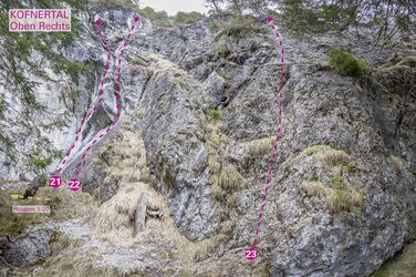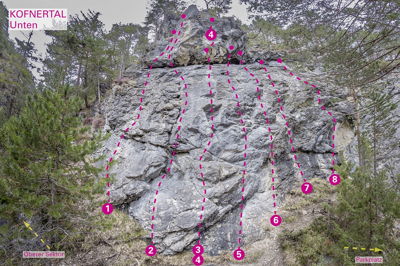 Der Bereich "Kofnertal Unterer Sektor" wurde als Projekt der Sportmittelschule Imst Unterstadt verwirklicht. Werner Nothdurfter schuf mit seinen Kletterschülern einen besonderen Klettergarten: alle Routen mit kurzen Bohrhakenabständen! Der Fels ist hier rauher und griffiger. Der nahegelegene Bach kann im Sommer als "Kühlschrank" für Getränke fungieren.