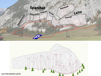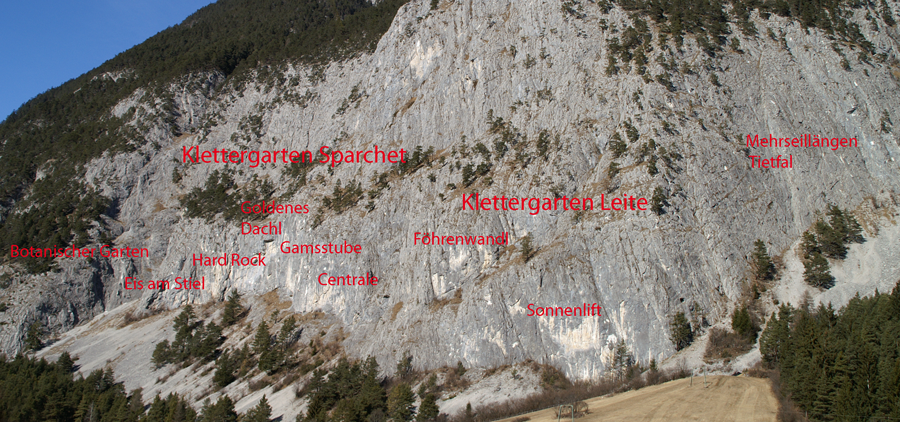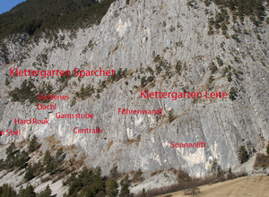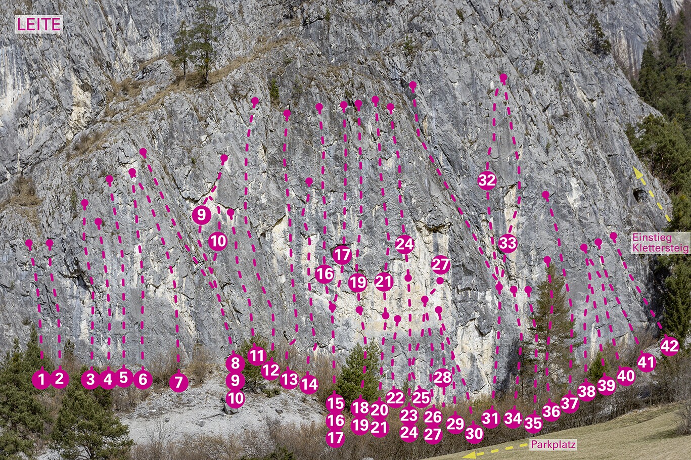 Der Klettergarten Leite ist eine senkrechte bis leicht überhängende glatte Wand.