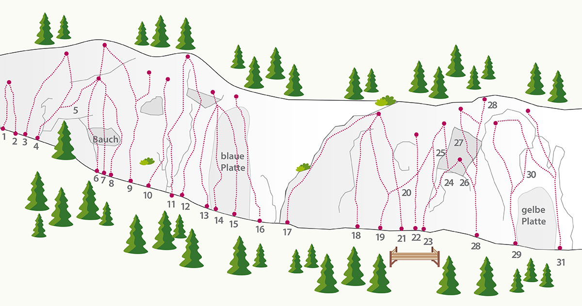 Der Klettergarten Walchenbach wurde für das Klettern mit Kindern eingerichtet und bietet für Neulinge ideale Bedingungen. Zustieg, Hakenabstände und Routen sind kurz und alle Routen sind mit Umlenkkarabinern versehen. Zudem ist die Wand nach Regen schnell wieder trocken. Auch an warmen Wintertagen kann hier geklettert werden. Im Klettergarten gibt es eine Routenübersichtstafel und die Routennamen sind an den Einstiegen angeschrieben. Ein Picknickplatz bietet Sitzgelegenheiten für 10 Personen.