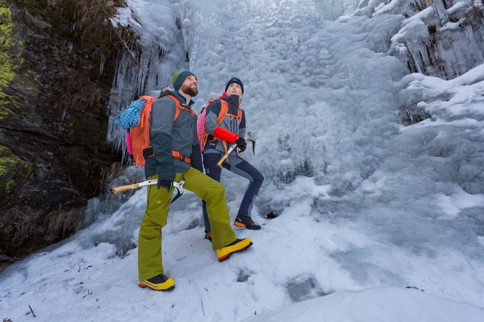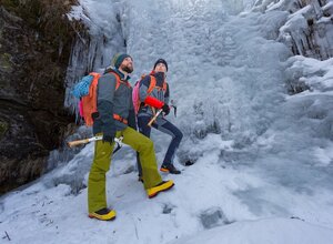 Steiler Eisfall mitten im Wald. Der Abstieg erfolgt durch Abseilen an Bäumen.