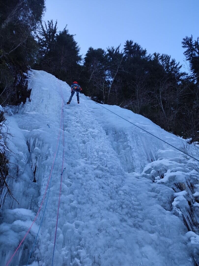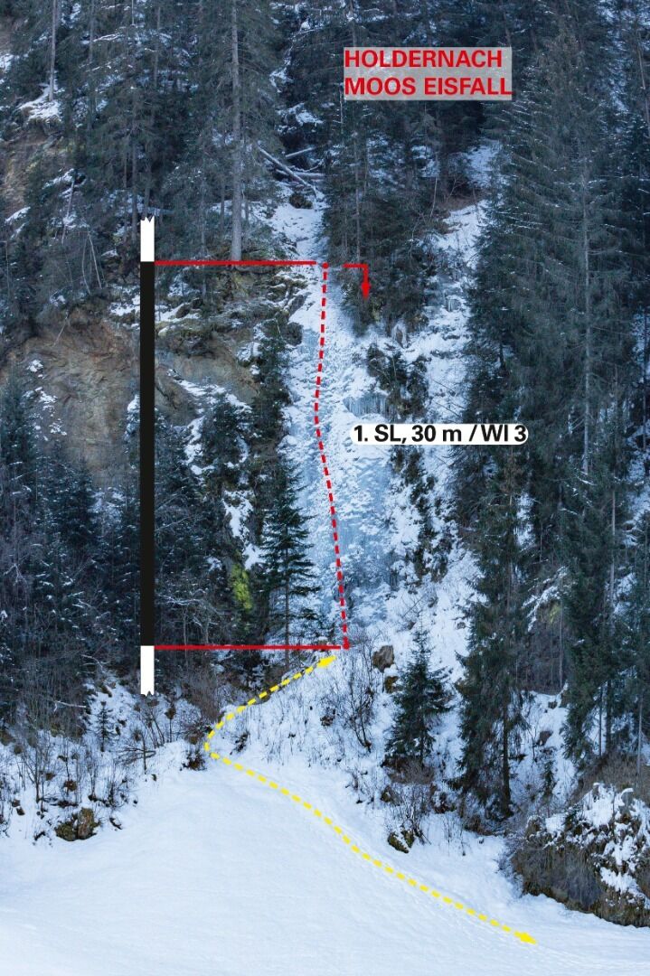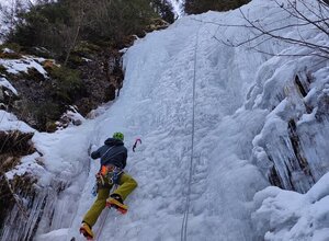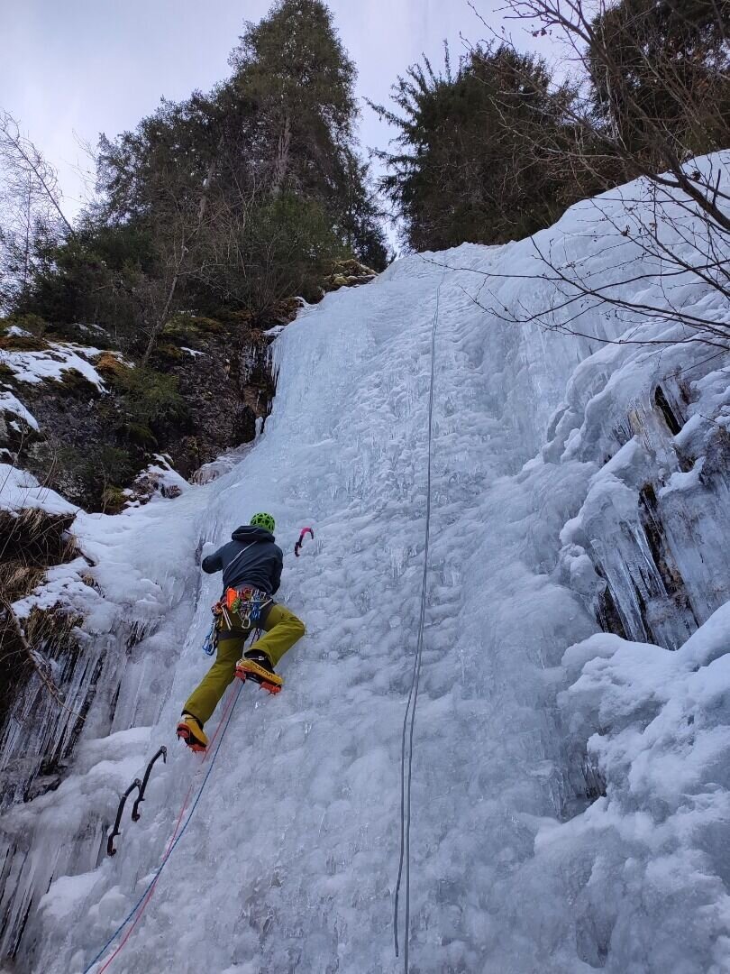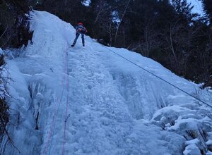Schöner einfacher und sehr schnell erreichbarer Eisfall, an dem gut Toprope geklettert werden kann. Der Abstieg erfolgt durch Abseilen an Bäumen.