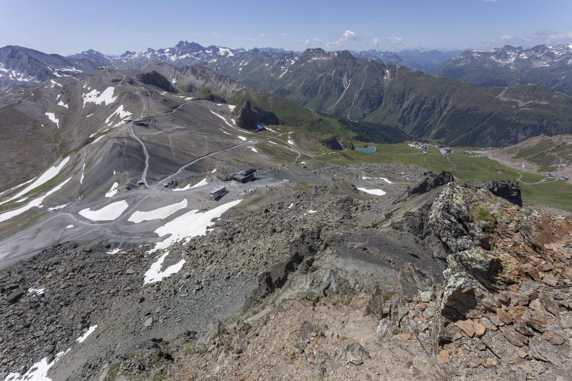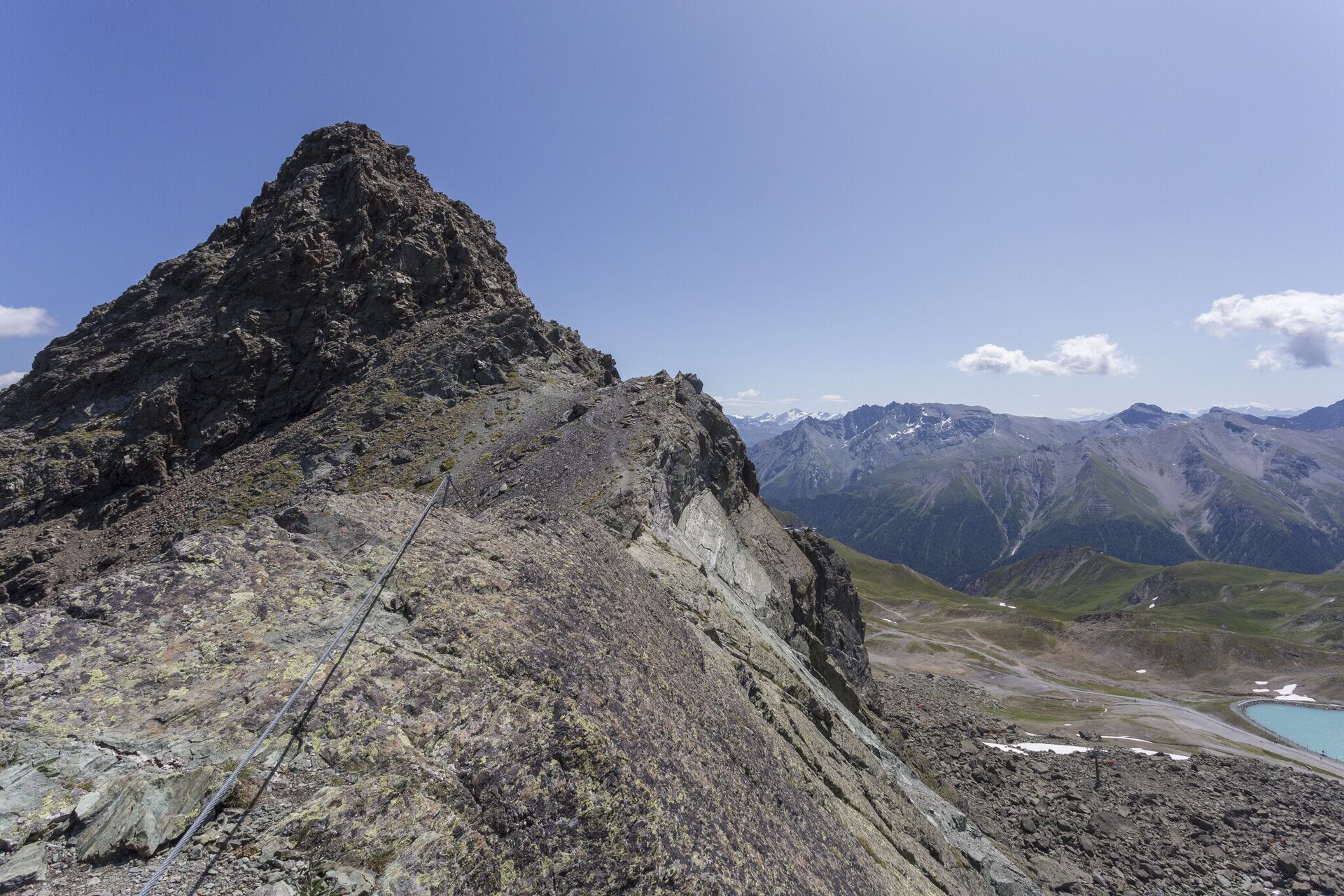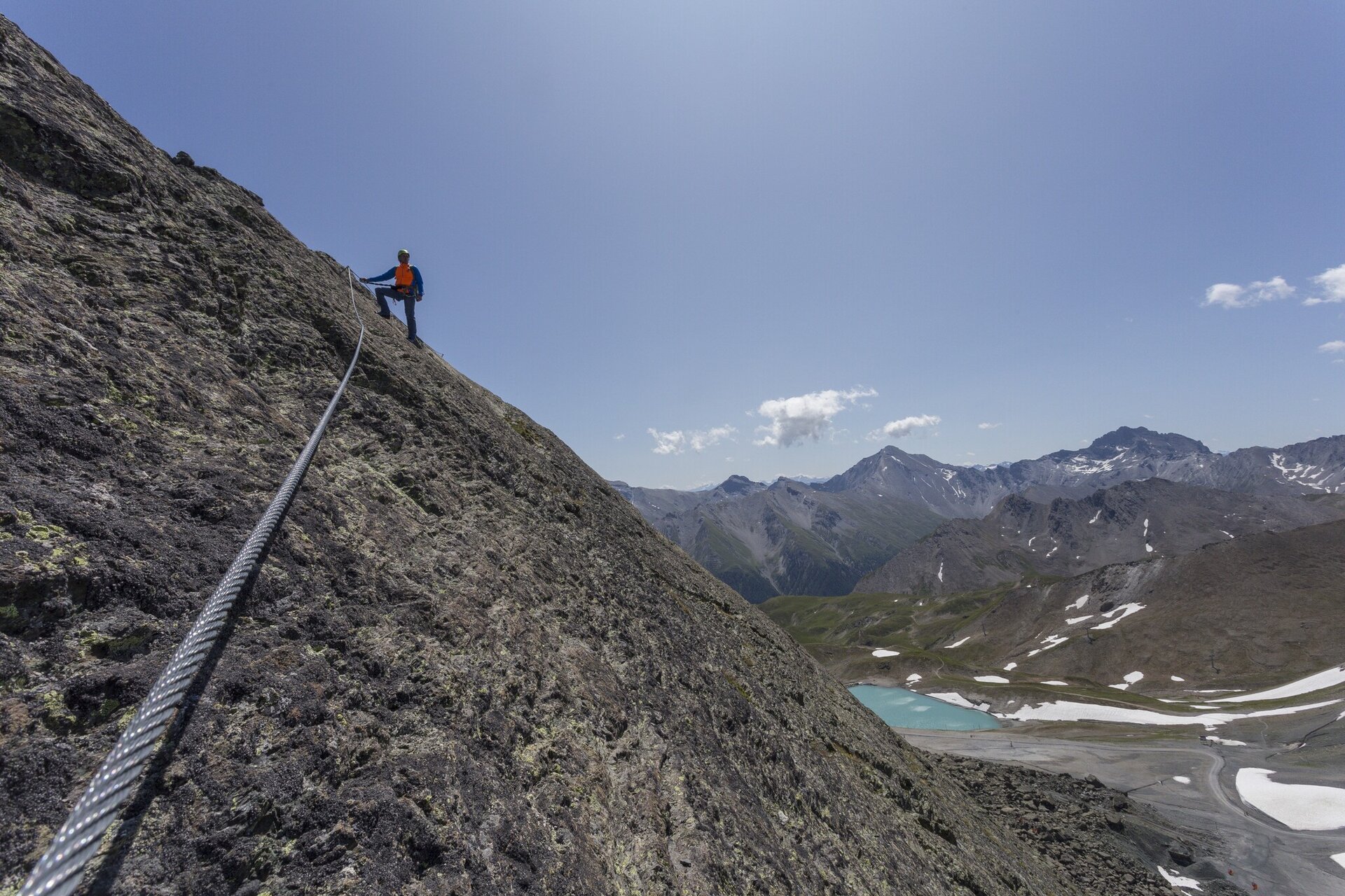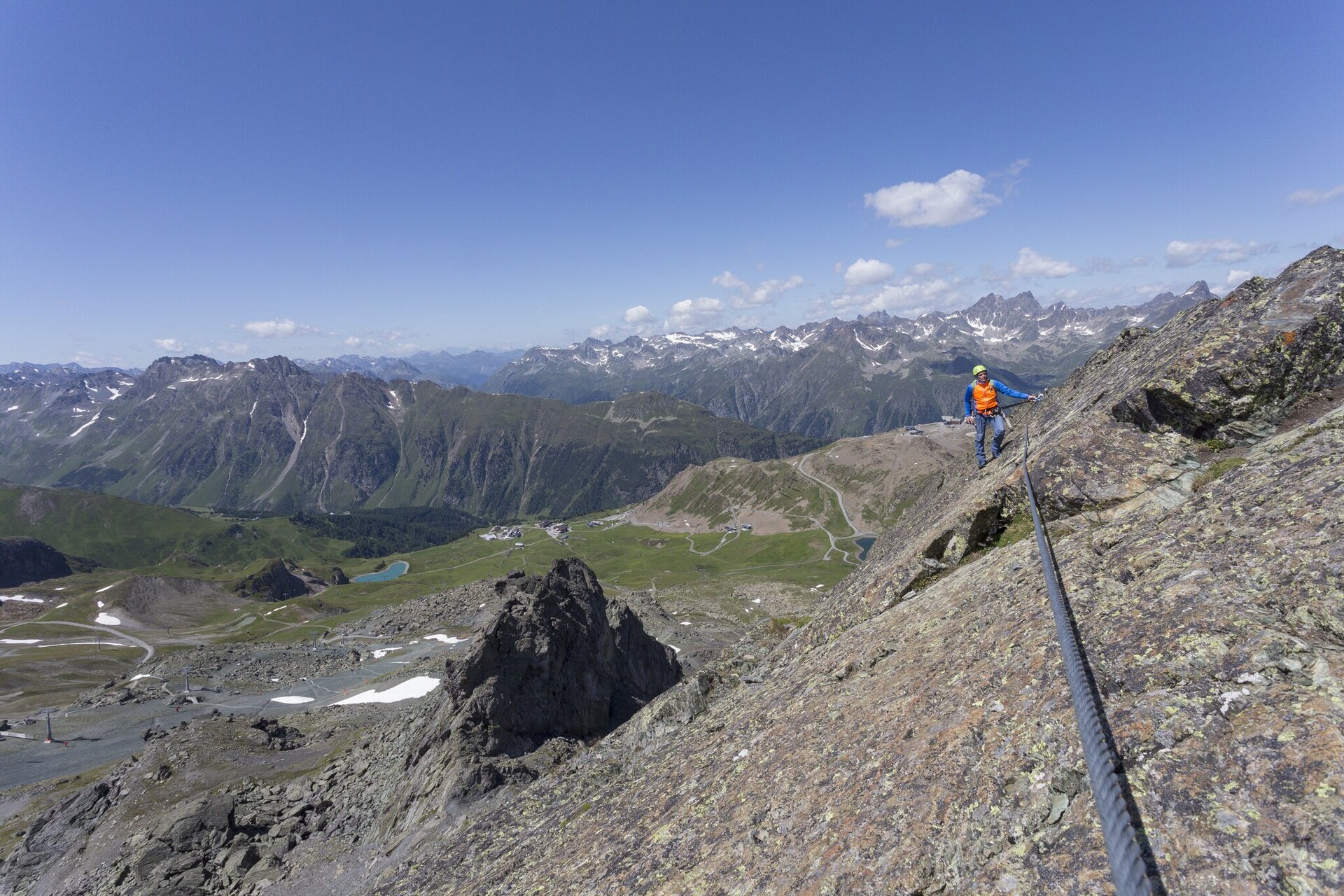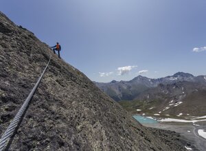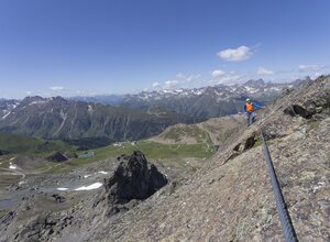Der Klettersteig Flimspitze an der Grenze zwischen Ischgl und Samnaun, bietet eine abwechslungsreiche Klettererfahrung mit Platten-, Kamin- und Gratkletterei. Der Steig startet auf 2.850 Metern Höhe, ist gut zugänglich und zeichnet sich durch seine attraktive Route in südwestlicher Ausrichtung aus. Er führt durch anspruchsvolle Kamine und brüchiges Gelände bis zum Gipfelaufschwung. Die Gesamtlänge der Kletterstrecke beträgt 80 Höhenmeter, und die Route nimmt etwa 1 Stunde und 40 Minuten in Anspruch. Die gute Erreichbarkeit von der Bergstation Flimjochbahn macht den Zustieg innerhalb von 15 Minuten möglich.