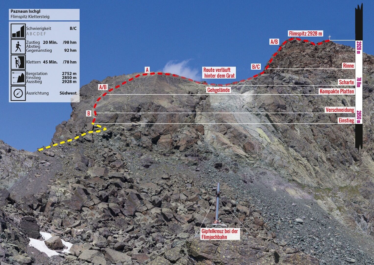 Auffahrt mit der Flimjochbahn. Von der Flimjochbahn Bergstation in Richtung Norden auf markiertem Steig. Nach ca. 400 m Abzweigung nach rechts bis unterhalb der markanten Felsplatte zum Einstieg; über die geneigte Platte bis knapp unterhalb des Grates, dem ausgesetzten Grat an der Südseite entlang und über wenig schwieriges Gelände zum Gipfelaufbau.