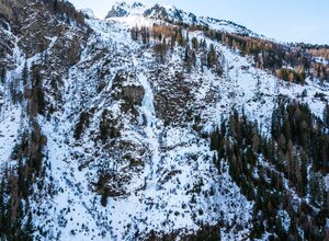 Vom Parkplatz entlang des rechten Lawinendammes bis zum Bachbett aufsteigen, dann entlang des Bachbetts hinauf zum Eisfall gehen.