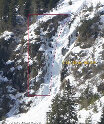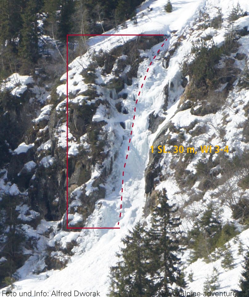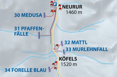 Köfels und parken dort. Nach überqueren der Brücke folgen Sie der Langlaufloipe weiter taleinwärts bis Sie unter dem Eisfall sind. Dann folgen Sie dem Bachbett bis zum Einstieg.