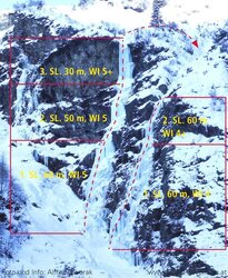 Vom Ausstieg nach rechts in die Rinne des rechten Eisfalls gehen, von dort weiter rechts über den sehr steilen Wald zum Einstieg abseilen. Oder über den rechten Eisfall abseilen.