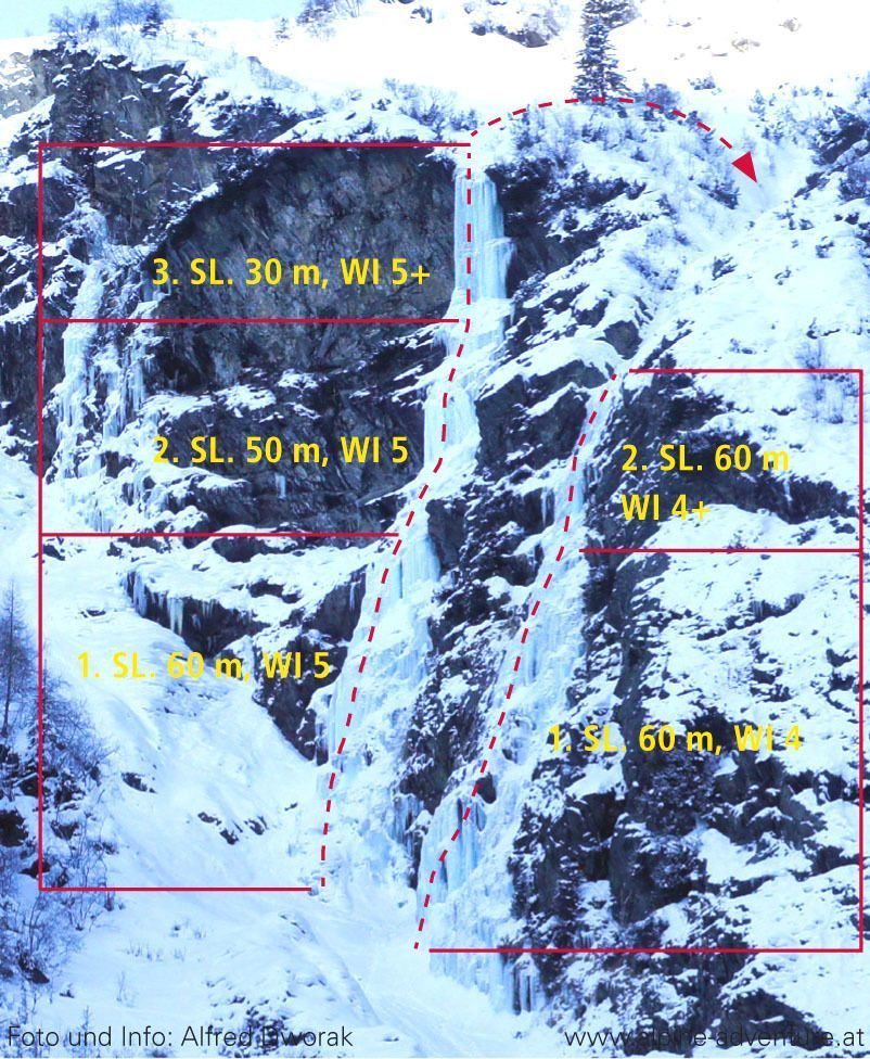 Zwei große, gut gestufte Eisfälle. Der linke Eisfall ist schwerer und länger als der rechte Eisfall.