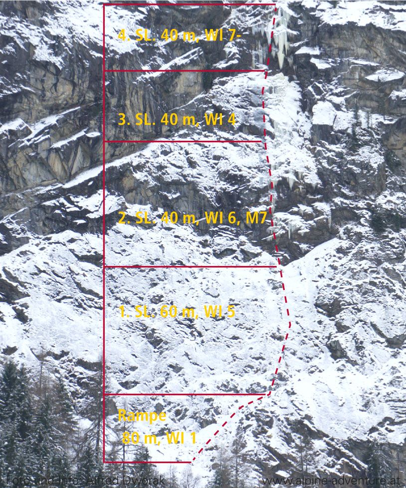 Schöne, sehr anspruchsvolle und extreme Eislinie. Teilweise durch Bohrhaken abgesichert. Die 180 Meter lange und schwierige Eiskletterei endet mit einem freistehenden Zapfen am Ausstieg im Bereich WI 7.
