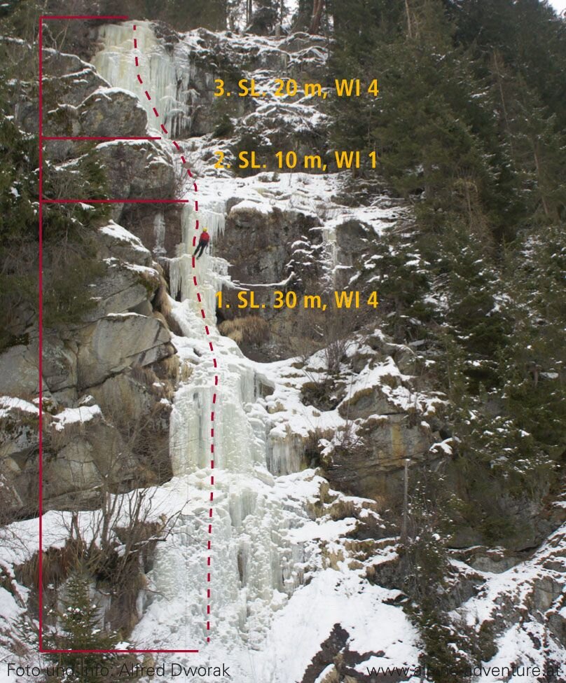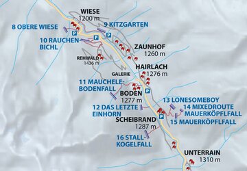 Durch die Ortschaft Scheibrand gehen und anschließend links durch den Wald zum Eisfall hinauf.