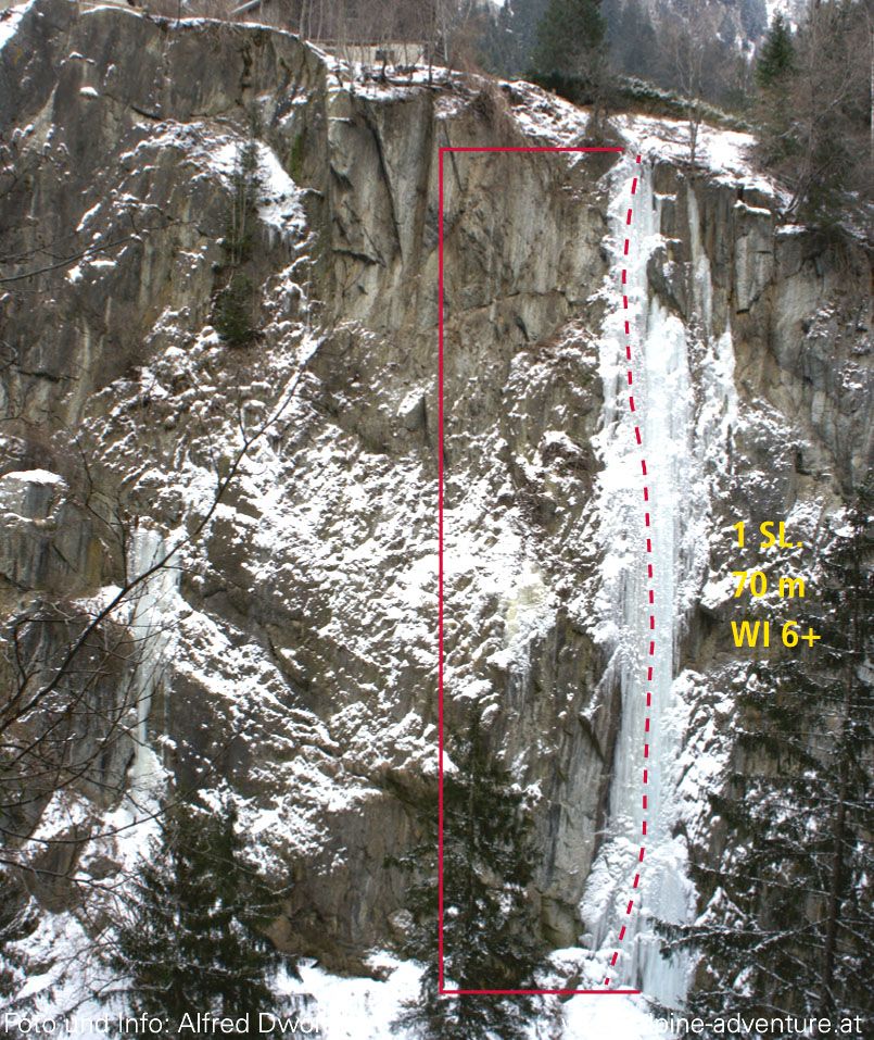 Drei extrem schwere, anspruchsvolle Eisfälle. Möglichkeit von Toprope. Seit einigen Jahren läuft vom Gasthof Schön fast kein Wasser mehr über die Wand, daher wenig bis kein Eis. Teilweise Mixedkletterei.