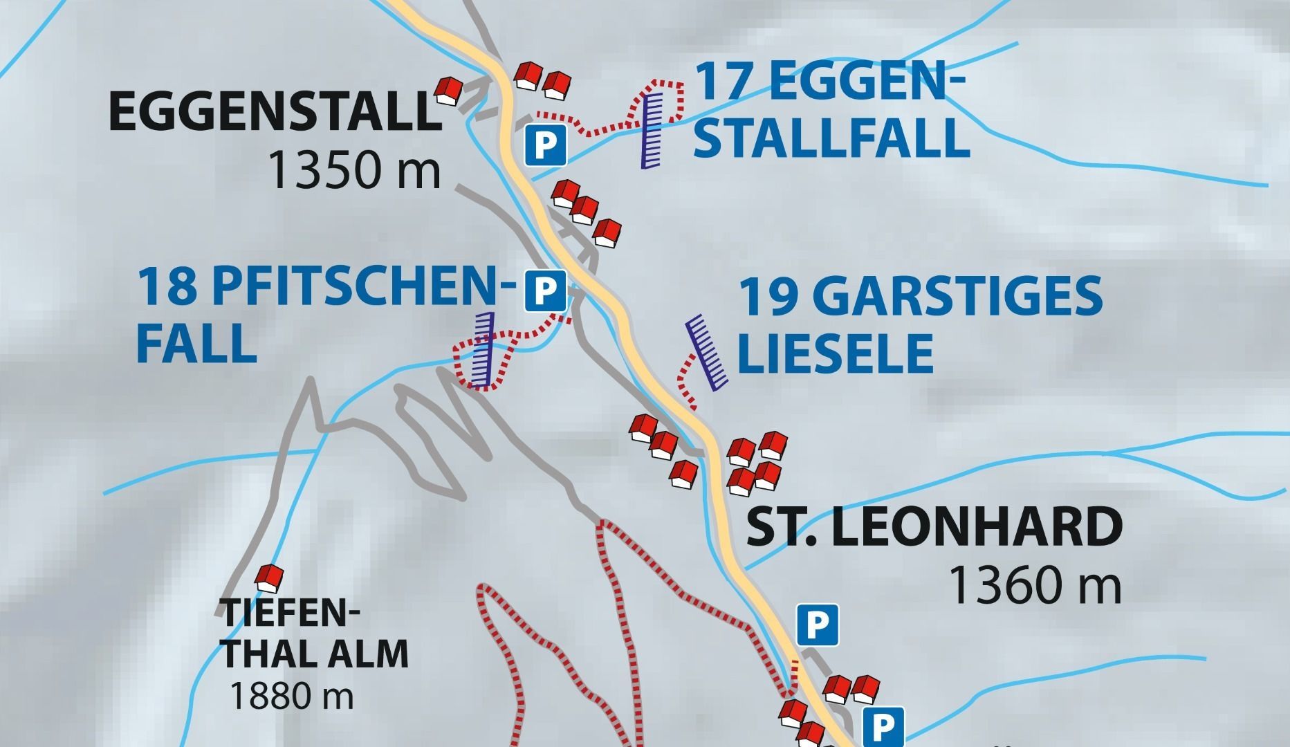 Vom Anfang des Ortes St. Leonhard dem Weg zum Waldrand folgen und zu beiden Eisfällen aufsteigen.