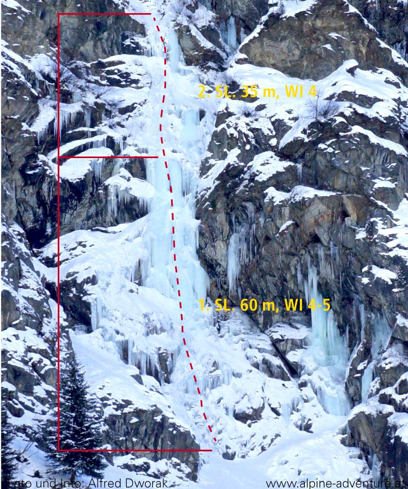 Richtung Almhof Pitztal gehen. Von dort kann man den Eisfall bereits sehen. Direkt bis zum Einstieg des Eisfalls aufsteigen.
