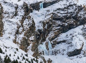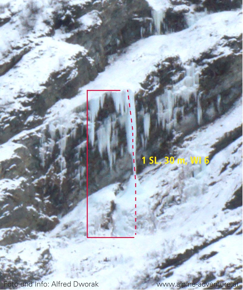 Extrem schwere Eissäule, die etwa auf 20 m frei steht. Nur kletterbar bei besten und sichersten Eisbedingungen. Die Eis Säule wurde am 30.01.2010 von Bernhard Hangl und Markus Praxmarer erstbegangen.