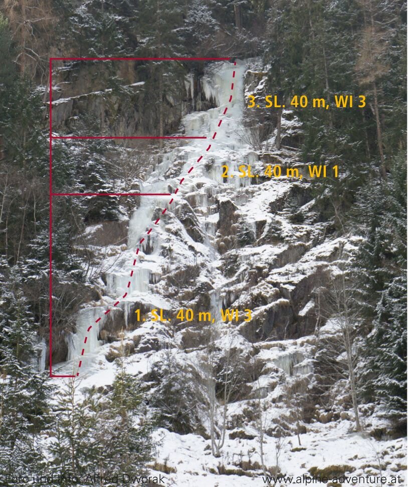 Rechts auf der Forststraße 300 Meter aufwärts in Richtung Holzbrücke gehen, 20 Meter vor der Brücke rechts den markierten Steig weiter gehen. In weiterer Folge zum Einstieg des Eisfalles links haltend hinauf.