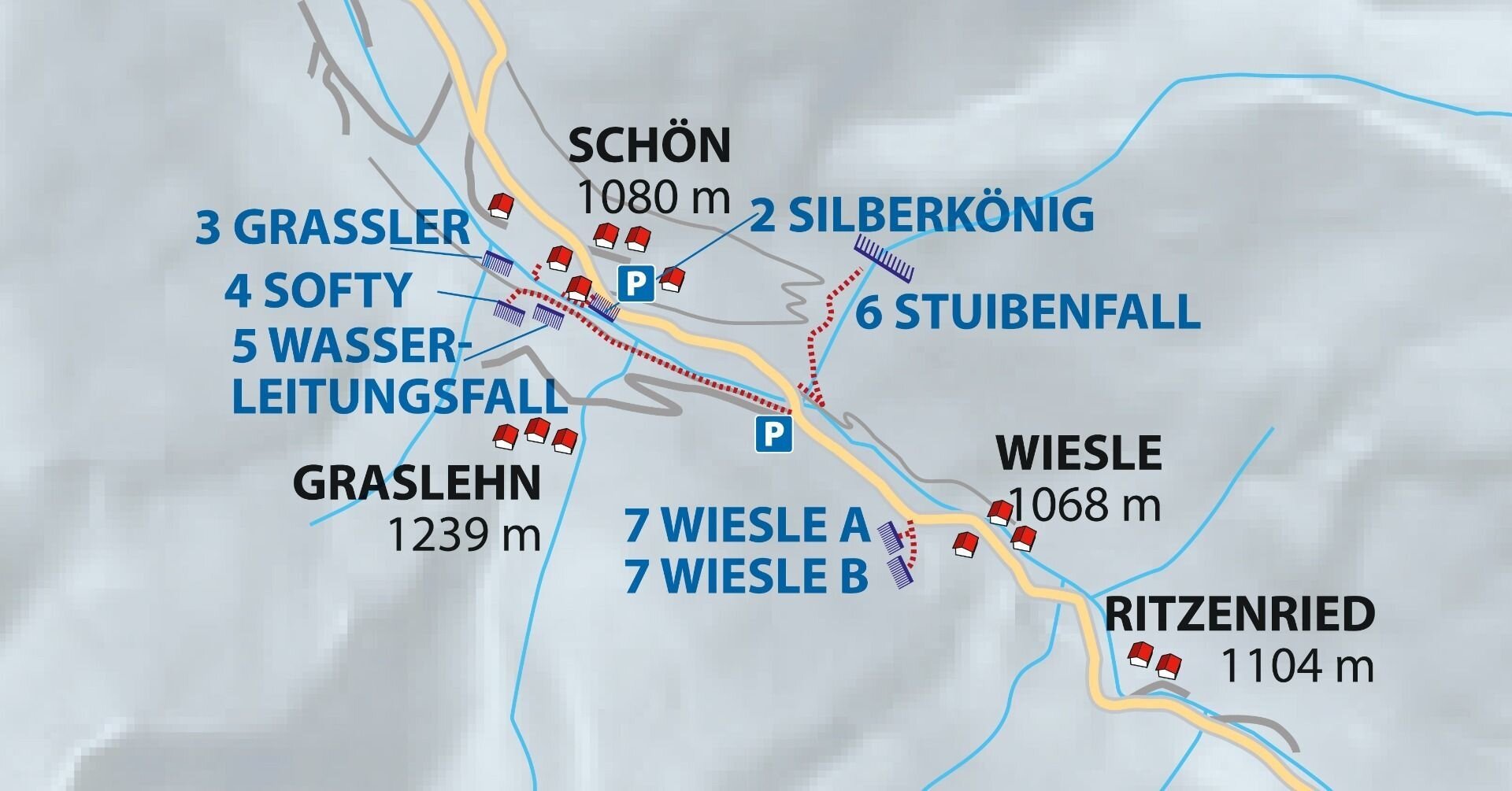Mit dem Auto: Von Wenns kommend taleinwärts bis nach Schön bzw. weiter bis kurz vor dem Weiler Wiesle fahren. Dort auf der linken Straßenseite parken.