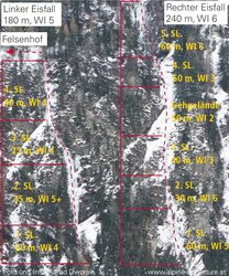 Beim linken Eisfall am Ausstieg schräg links durch den Wald hinauf bis zum Weiler Rehwald. Dann auf der Forststraße eine Kehre hinunter, bis links ein Steig zurück zum Parkplatz führt. Beim rechten Eisfall noch ca. 30 Höhenmeter bis zur Forststraße nach Rehwald aufsteigen.