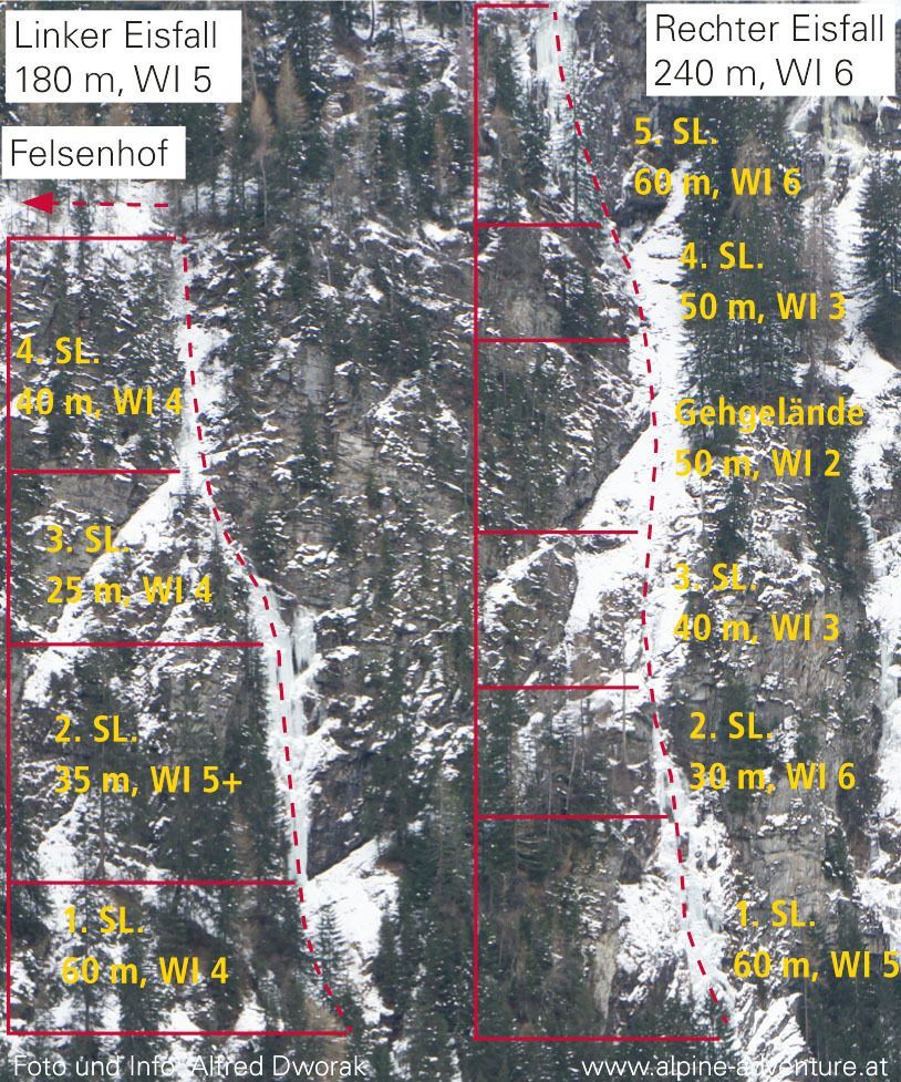 Vom Parkplatz den markierten Steig in Richtung der Unterkunft Felsenhof bis dorthin folgen, wo er links abbiegt. Hier gerade hinauf zu den Eisfällen.