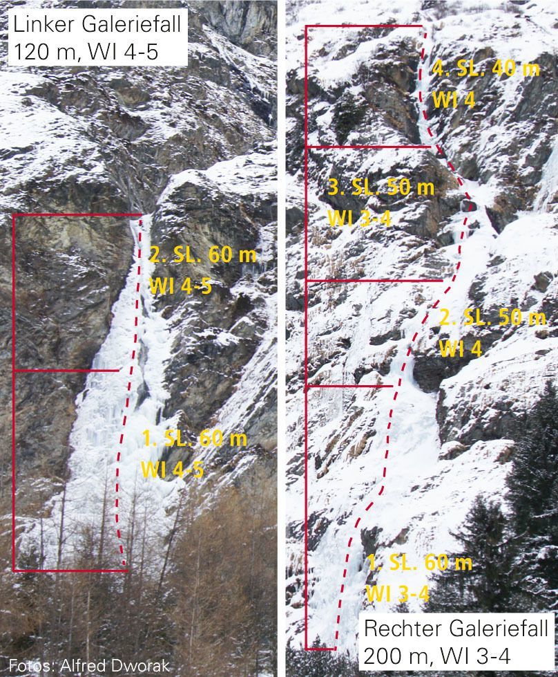 Über den Hang, der sich oberhalb der Lawinengalerie befindet bis zu den Eisfällen aufsteigen.