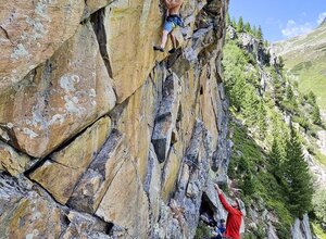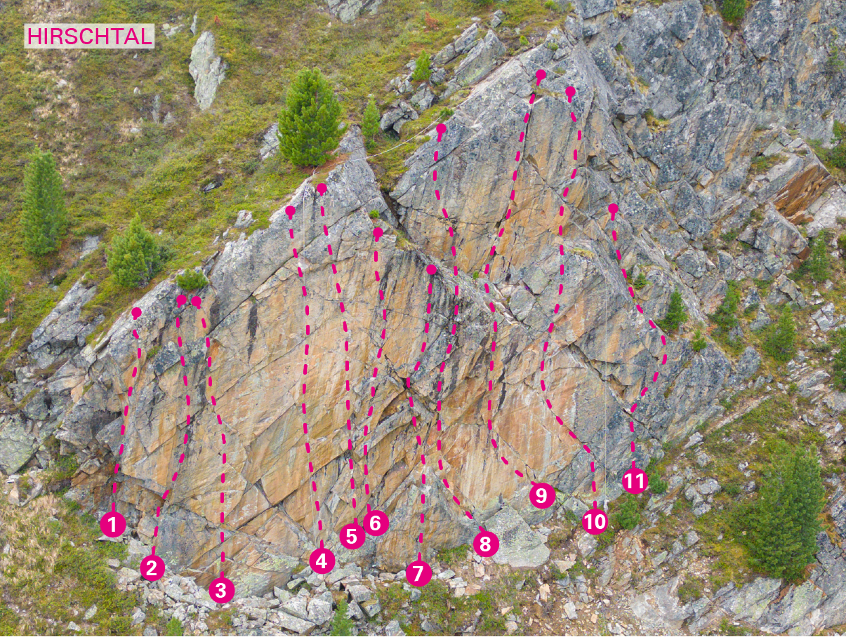 Nur ca. 15 Gehminuten von der Bergstation der Rifflseebahn abwärts befindet sich der Klettergarten Hirschtal. Die 11 Routen sind im mittleren Schwierigkeitsgrad zwischen 5c+ und 7b+ angelegt. Die Neigung der Felswand ermöglicht einen wunderschönen Blick in Richtung talauswärts zu den Weilern Tieflehn, Plangeroß und Weißwald.