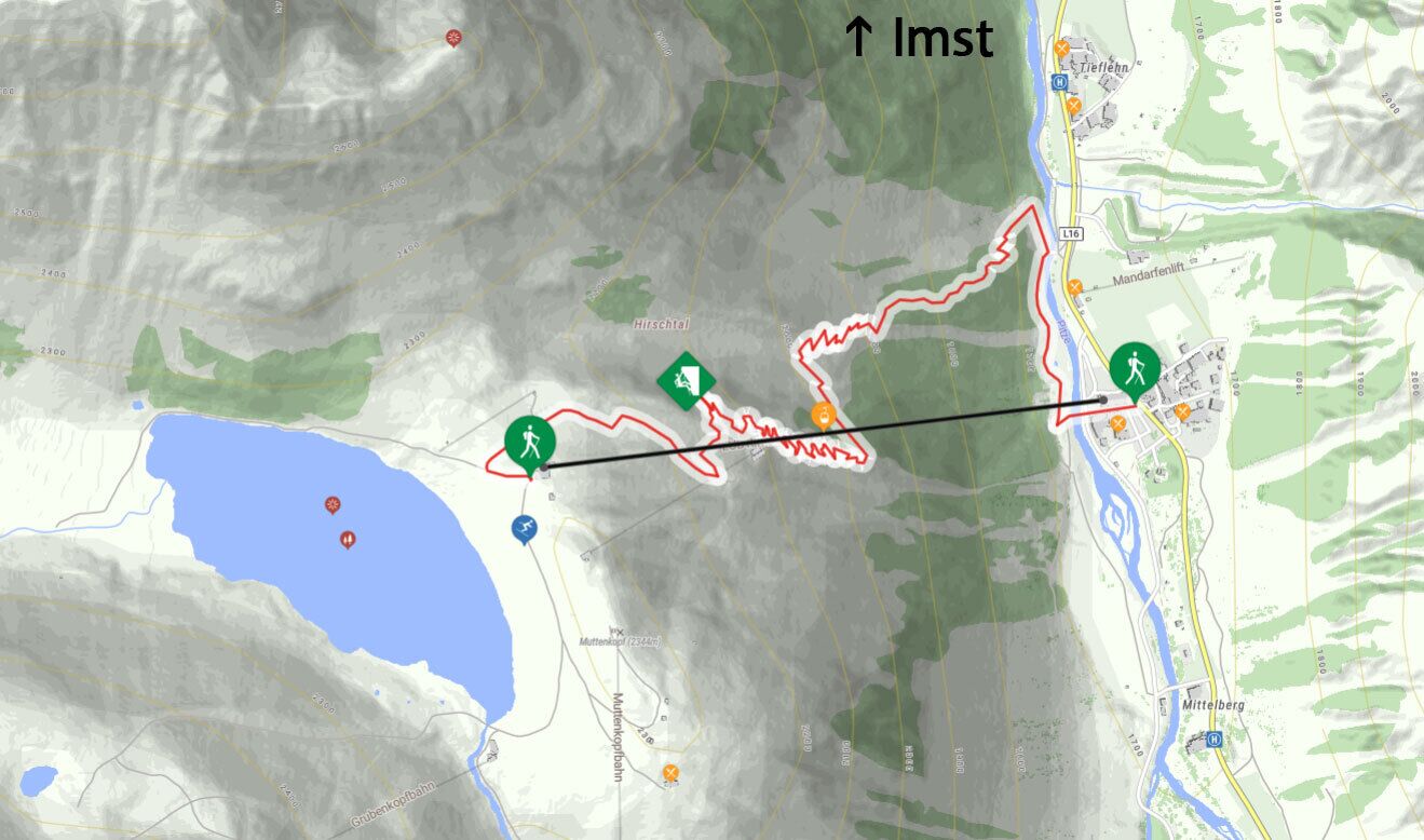 Von der Autobahnausfahrt A12 „IMST – Pitztal“ folgen Sie dem Straßenverlauf Richtung Pitztaler Gletscher für ungefähr 45 Minuten. In Mandarfen (1 km vor dem Pitztaler Gletscher) können Sie Ihr Auto nördlich der Rifflseebahn parken.