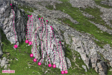 10 Routen in der Schwierigkeit von 4a+ bis 6a.